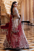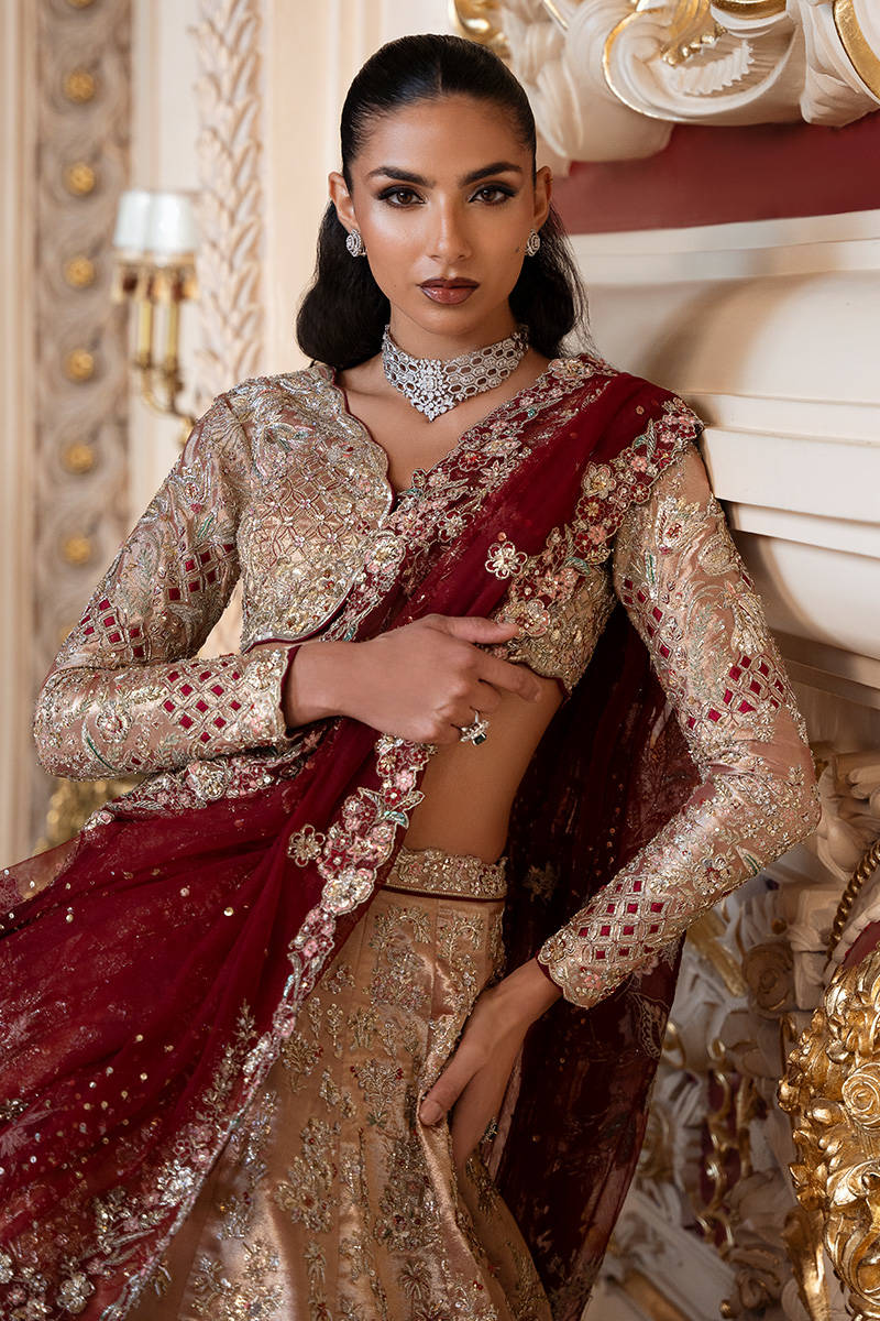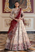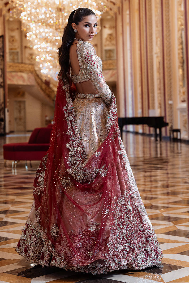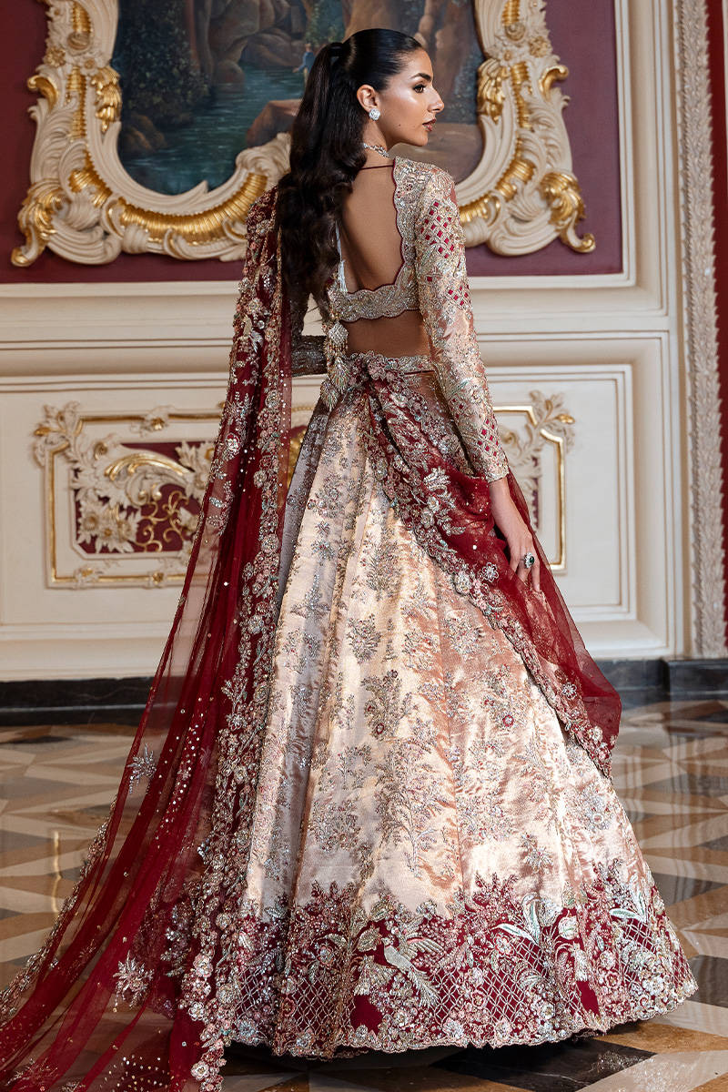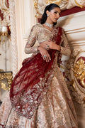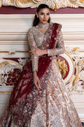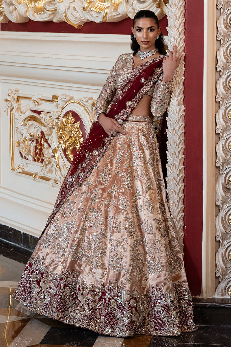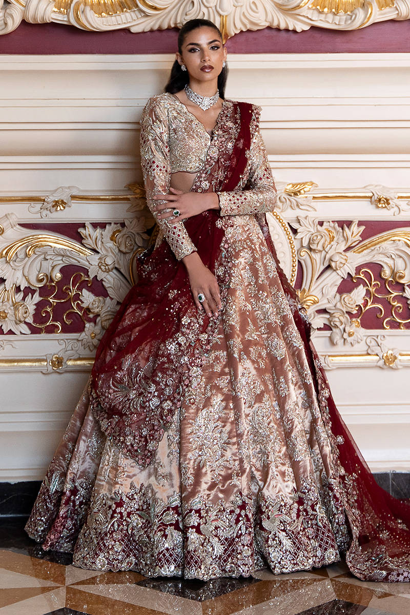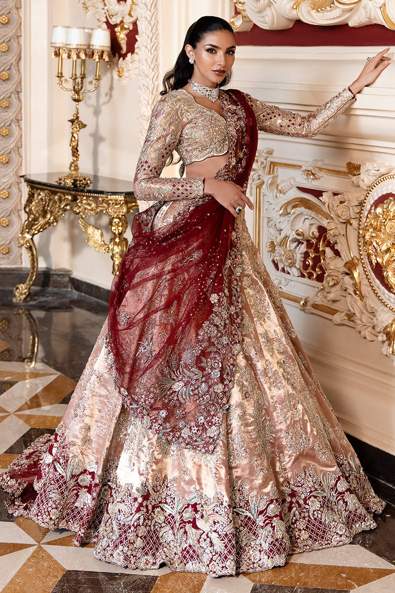A timeless tea-pink pure tissue lehenga choli, lavishly hand-embellished with Swarovski crystals, dabka, and zardozi, creating a masterpiece of elegance and grandeur. The silhouette is enhanced with regal maroon finishing along the hem, adding a striking contrast that captures the eye. The outfit is paired with a deep maroon net dupatta, exquisitely adorned with resham embroidery, sequin spray, hand-embellished boti work, and intricately worked heavy borders. A flawless blend of tradition and modernity, this look is perfect for the bride who seeks both grace and opulence.