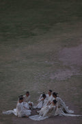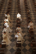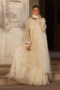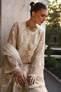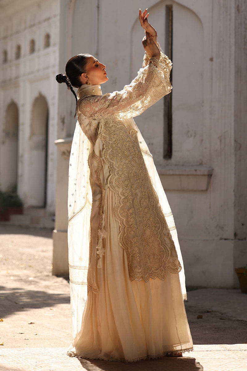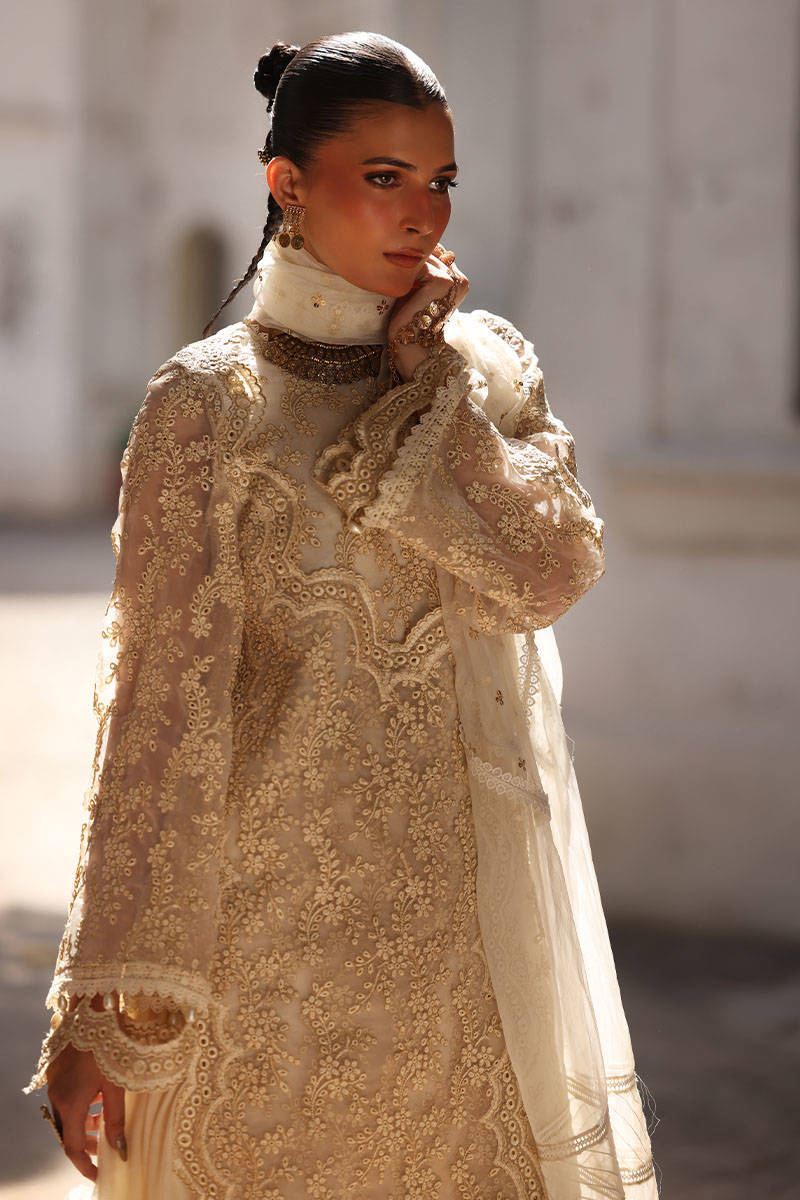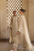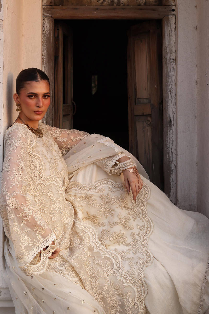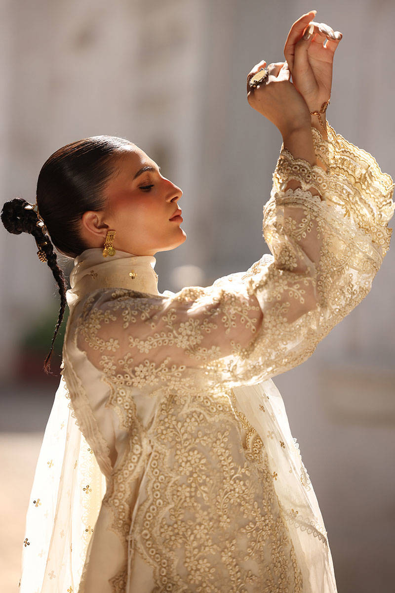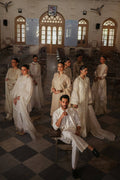 This flowing angrakha imagined in moonlit white is crafted in airy organza and adorned with delicate multi-head embroidery that traces the surface like a memory made visible. The borders of the sleeves and the hem of the skirt are further enriched with embroidered detailing, lending a quiet grandeur to its movement. The look is completed with a sheer organza dupatta, decorated with subtle trims on all four sides, and a pair of coordinating trousers in the same tone. Making it an Eid ensemble that feels summery yet festive.