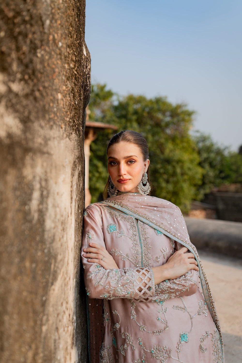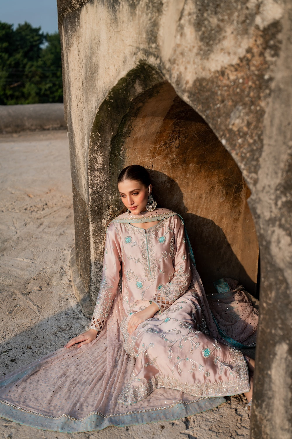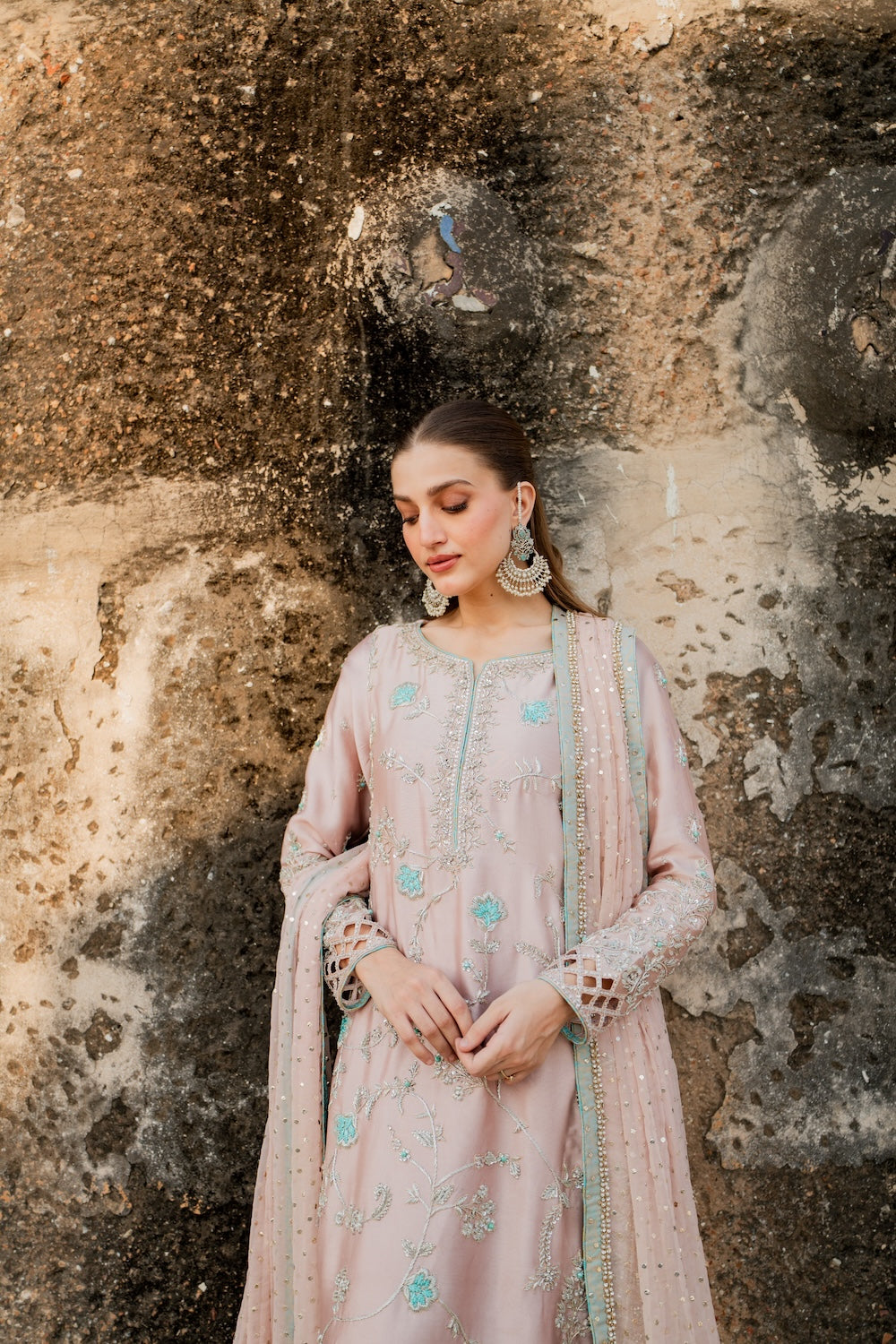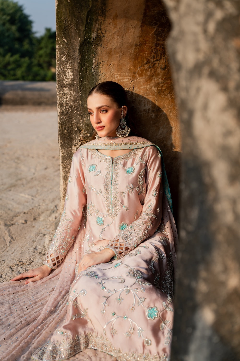 Rubab is a showstopper! This powder pink ensemble shines with intricate silver dabka work, beautifully accented by ferozi threadwork and stunning detailing on the neckline and sides. Paired with a luxurious chann dupatta, it’s elegance at its finest