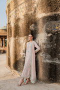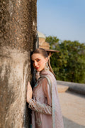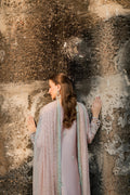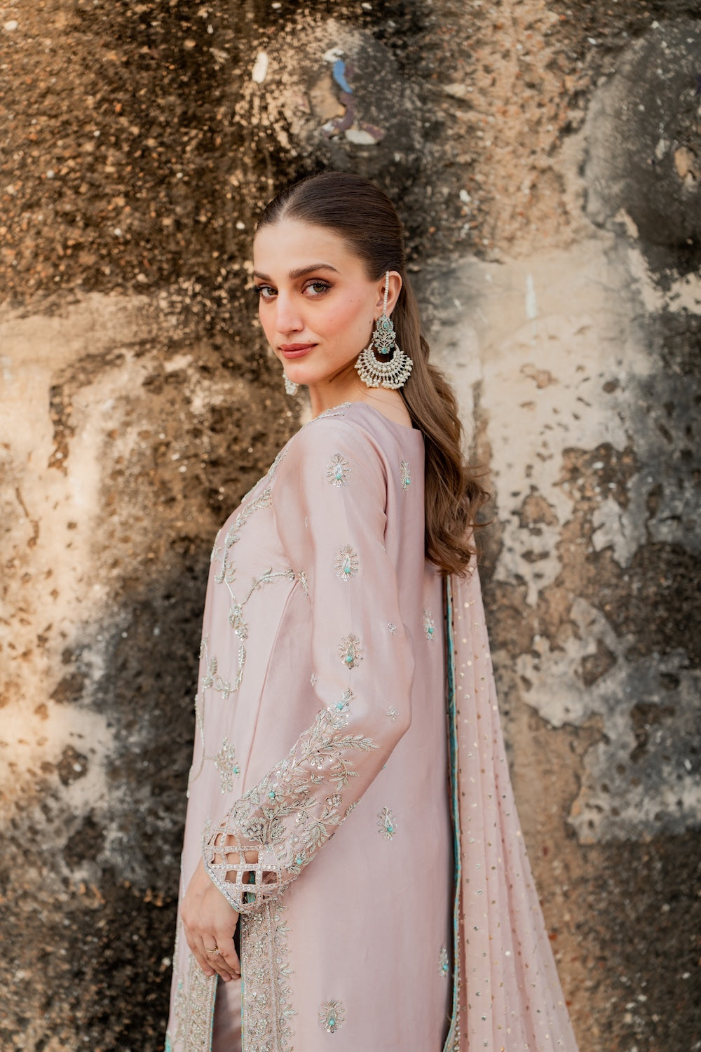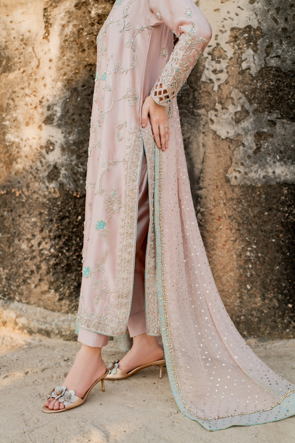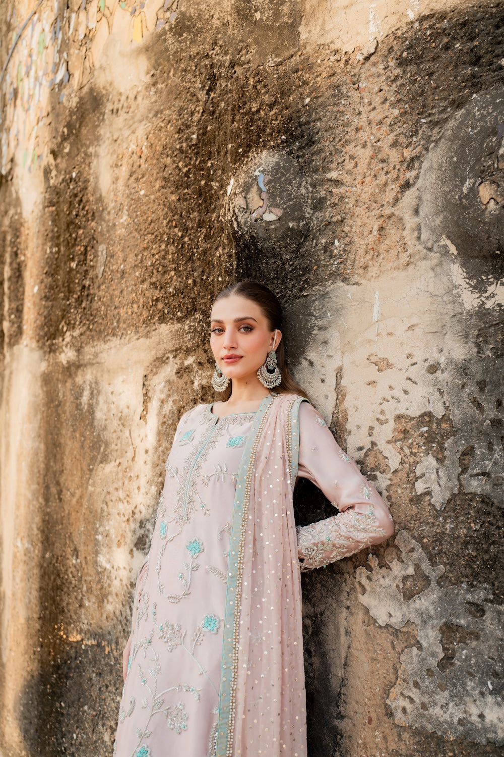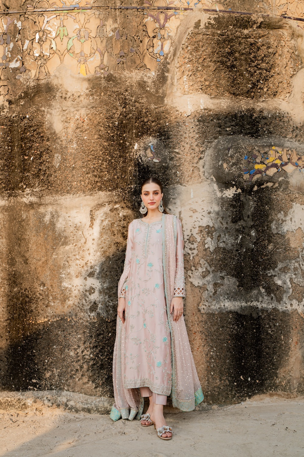 Rubab is a showstopper! This powder pink ensemble shines with intricate silver dabka work, beautifully accented by ferozi threadwork and stunning detailing on the neckline and sides. Paired with a luxurious chann dupatta, it’s elegance at its finest