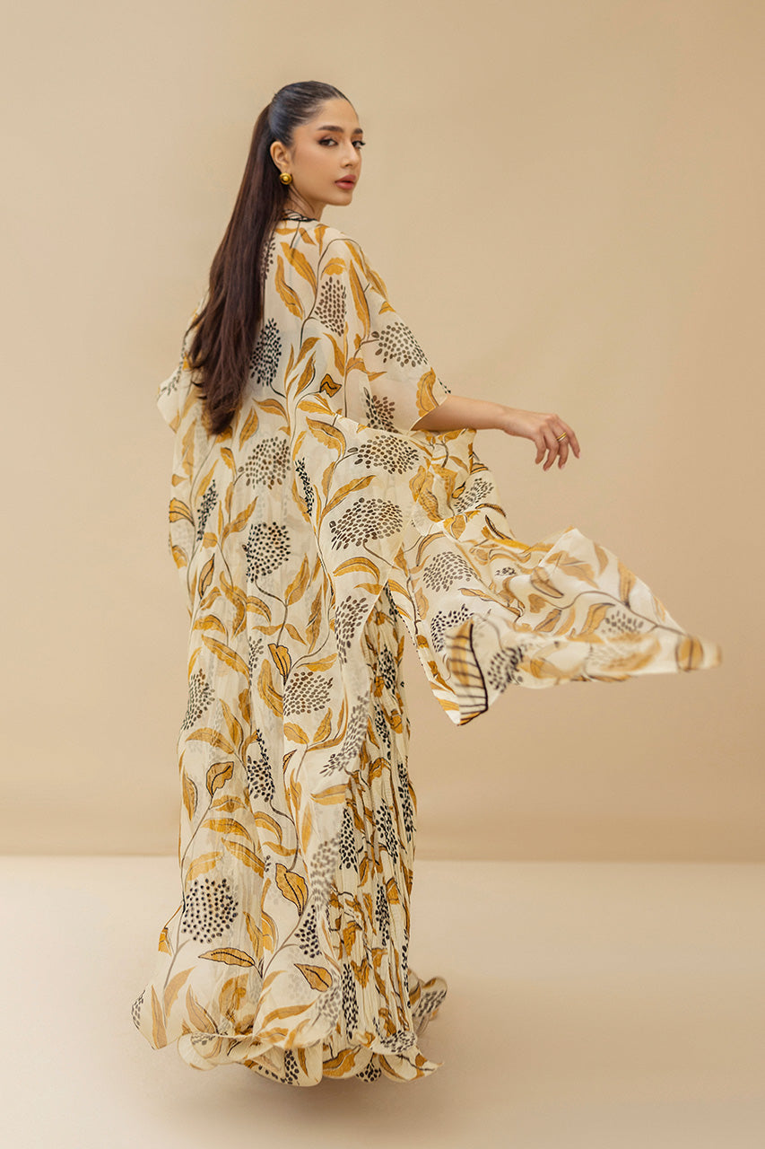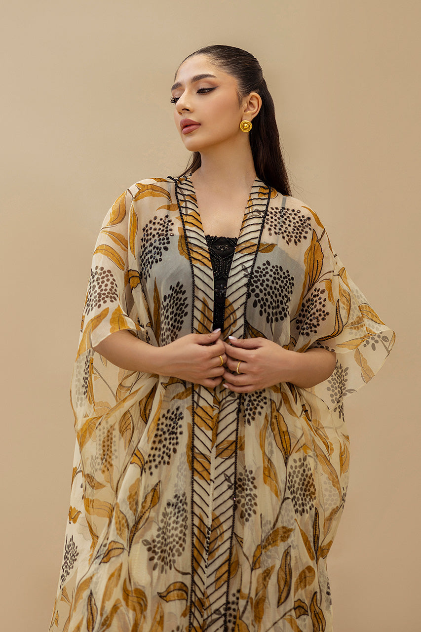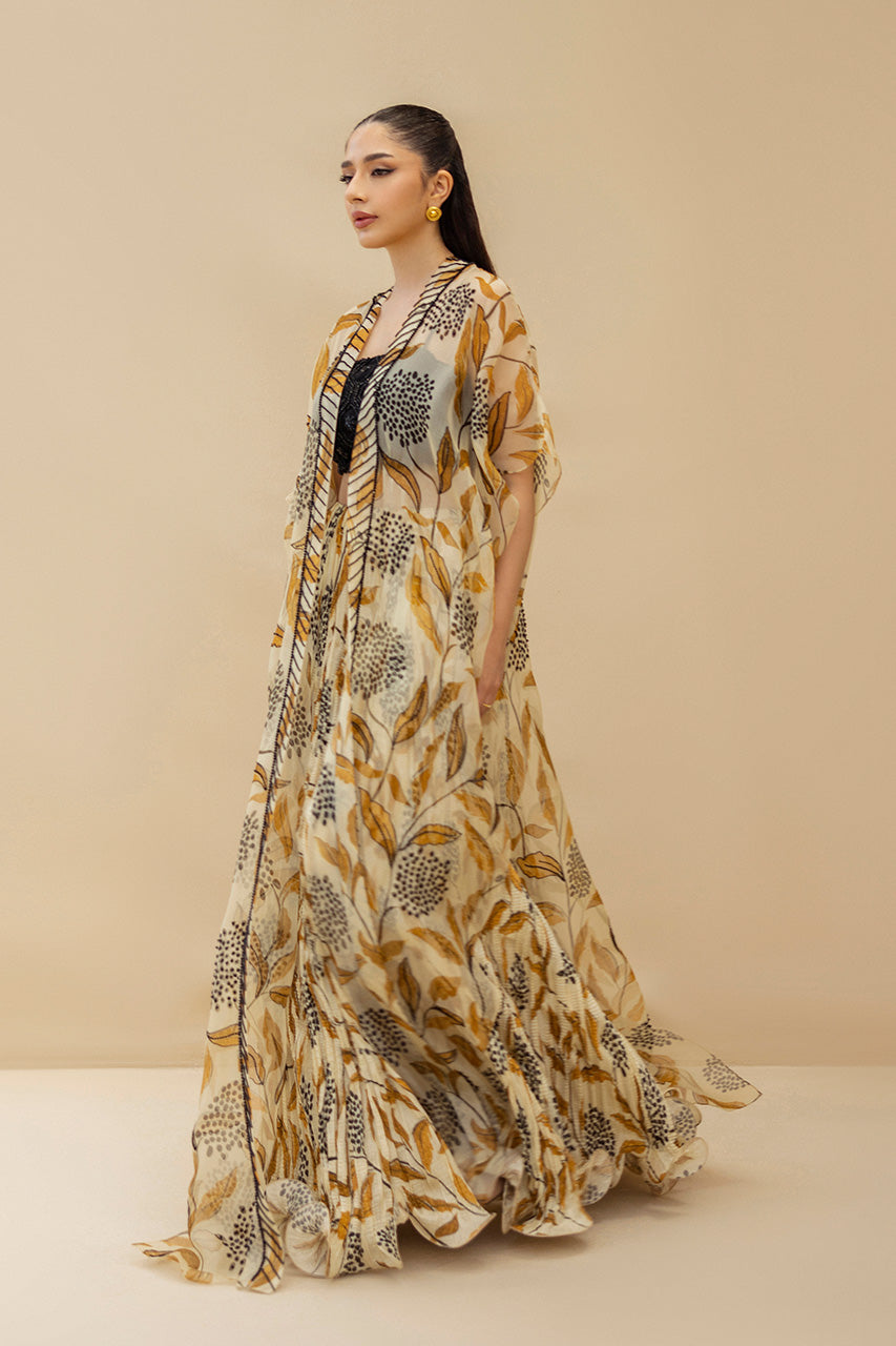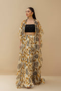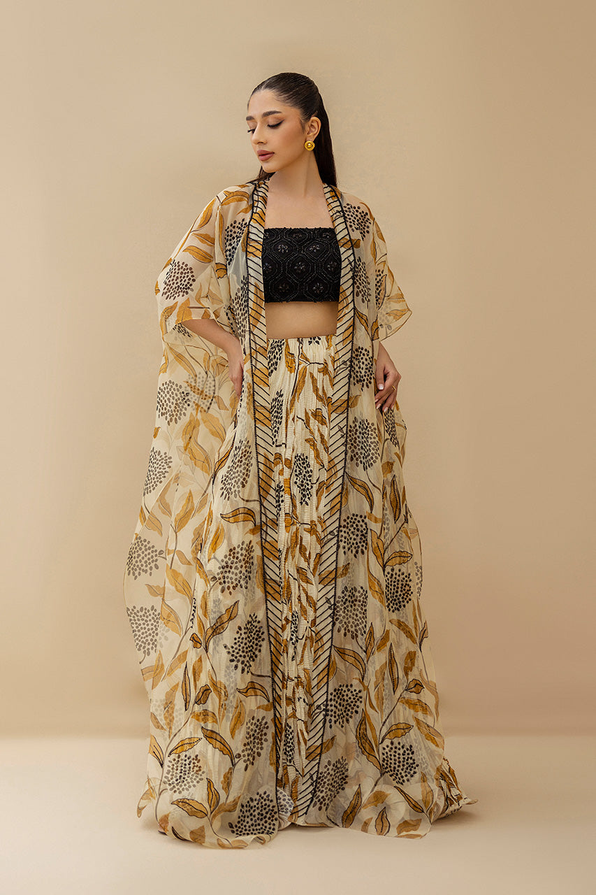 A three piece set that celebrates fluidity and form, crafted from feather light organza jacket layered over pure rawsilk tube top and pre draped skirt. The front open jacket, cut in a languid kimono silhouette, carries botanical motifs in ochre and ebony, printed to echo the rhythm of nature. Its flowing front is framed with ebony beads hand embroidered linearly, creating effortless drama. A fitted bandeau, worked in intricate ebony bead embellishment, brings structure and edge. Geometric embroidery contrasts the softness of the overlay. Paired with pre draped skirt in matching flora mirror the jacket’s cadence, pleated at the waist for volume that moves like a whisper with every step.