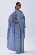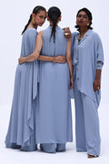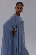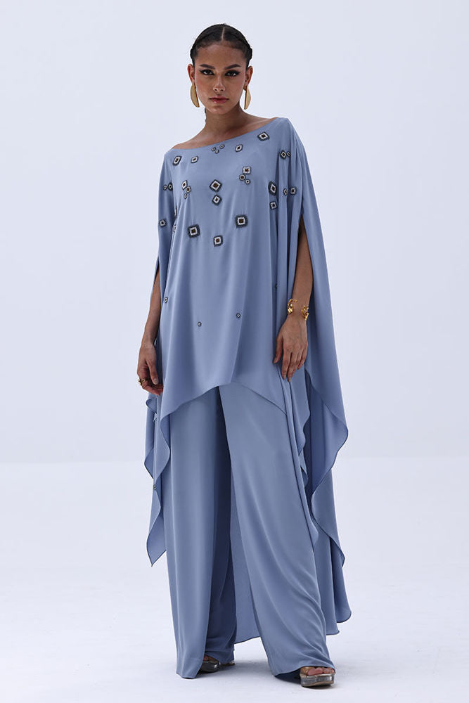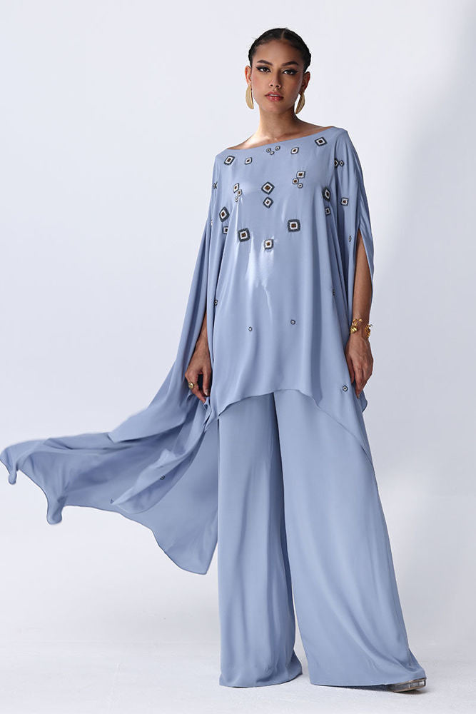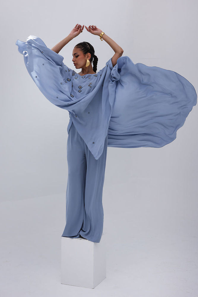 Step into elegance with this dreamy Blue Fog-colored outfit made from lightweight georgette. The top is adorned with intricate handwork boti detailing, beautifully complemented by matte moti (pearl) embellishments that add a soft shimmer. Paired with modern culottes, this ensemble strikes the perfect balance between traditional charm and contemporary style.