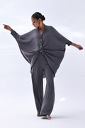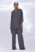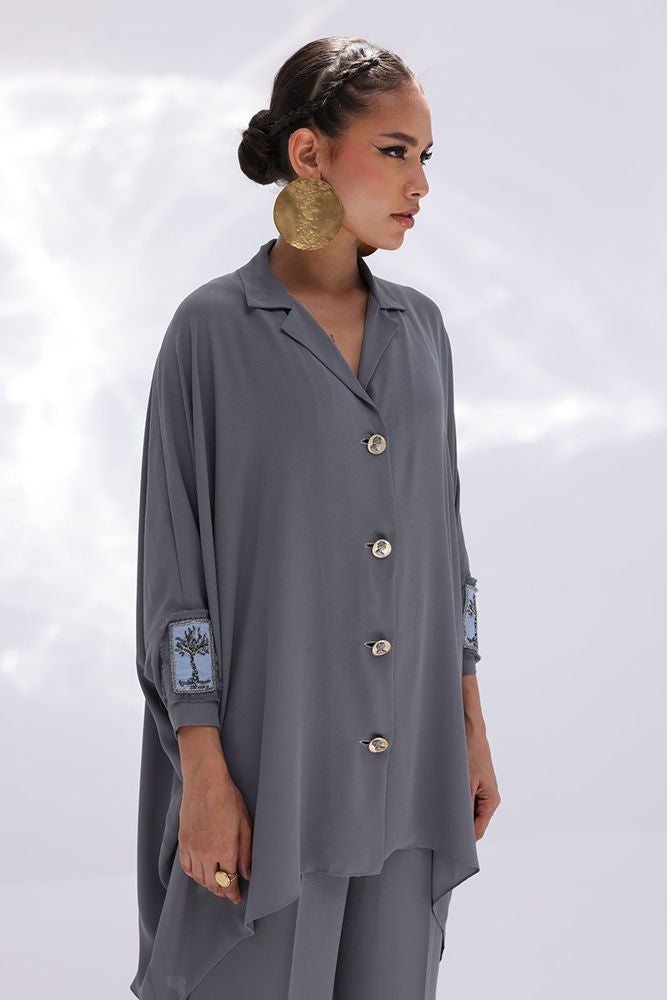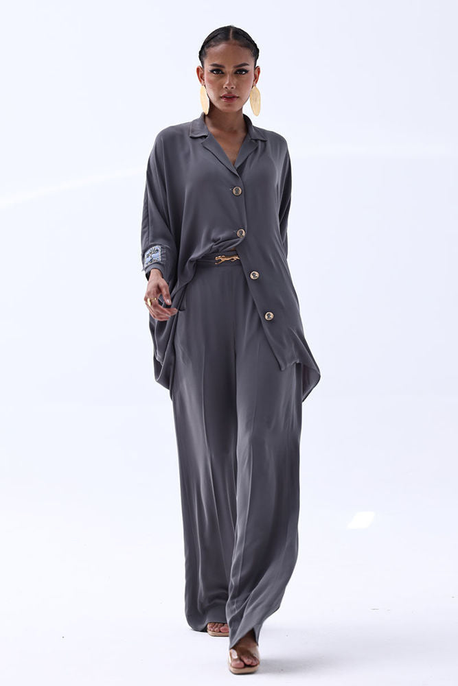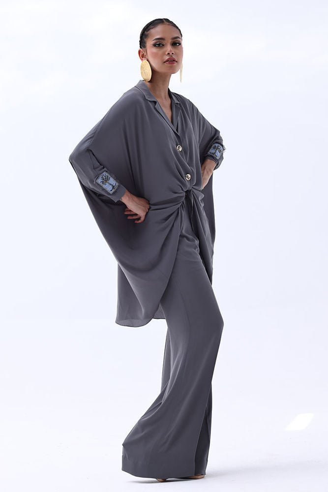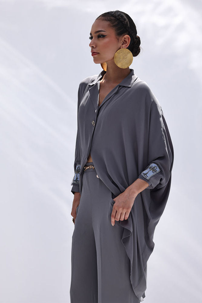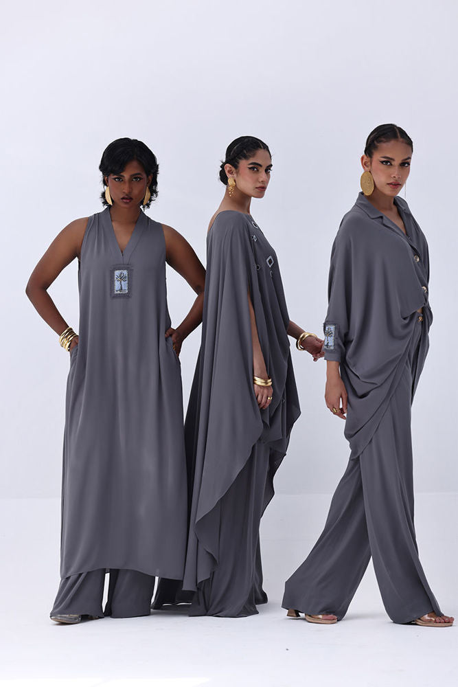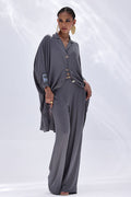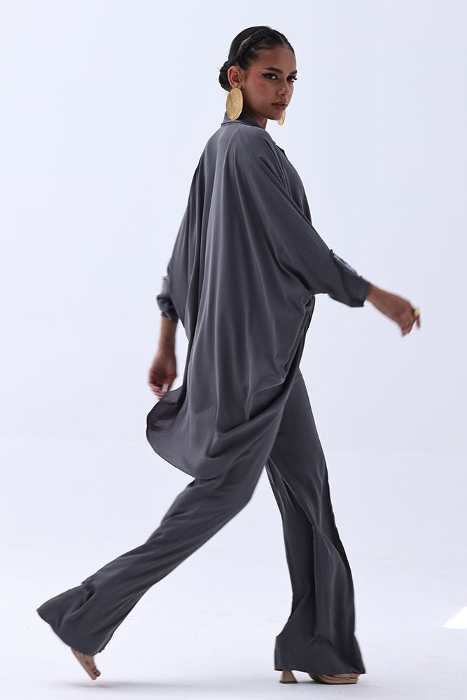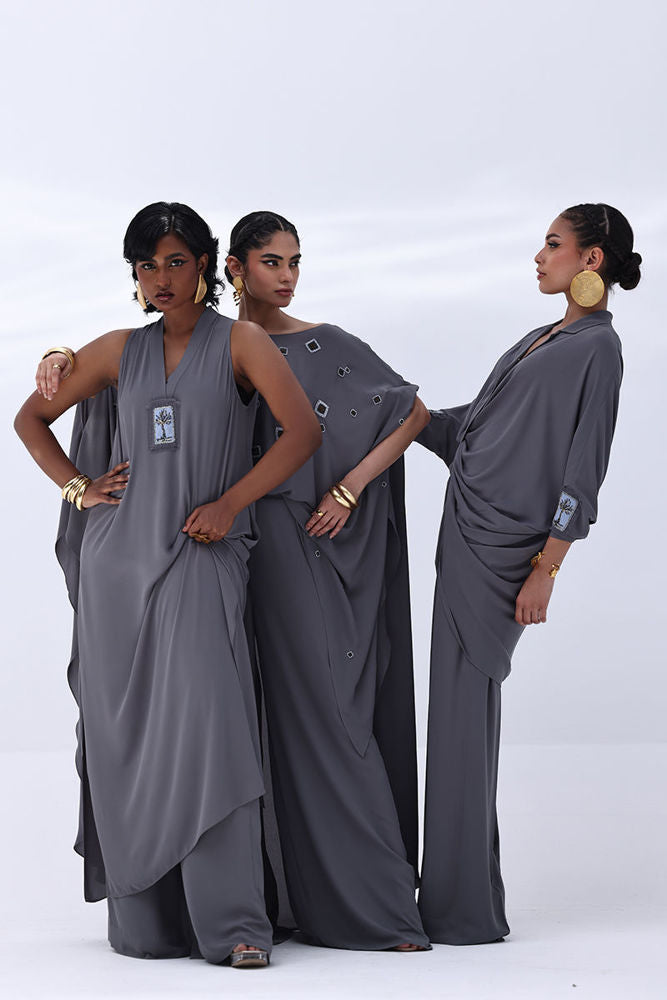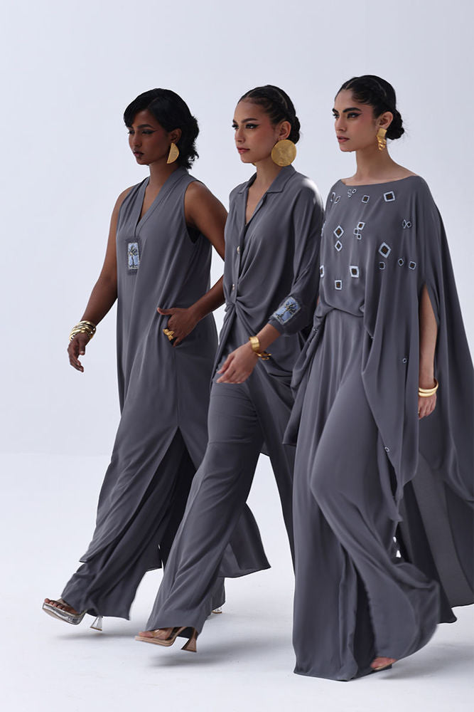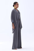 Timeless and refined, this Charcoal Grey Georgette outfit features hand-crafted bunch work on both sleeves, adding a touch of artisanal charm. Intricately adorned with gold and multiple shades of grey Cut Dana, the embellishments catch the light with subtle brilliance. The flowing georgette fabric enhances the graceful silhouette, making it ideal for sophisticated evenings and special occasions.