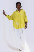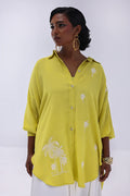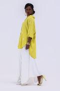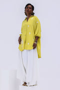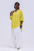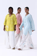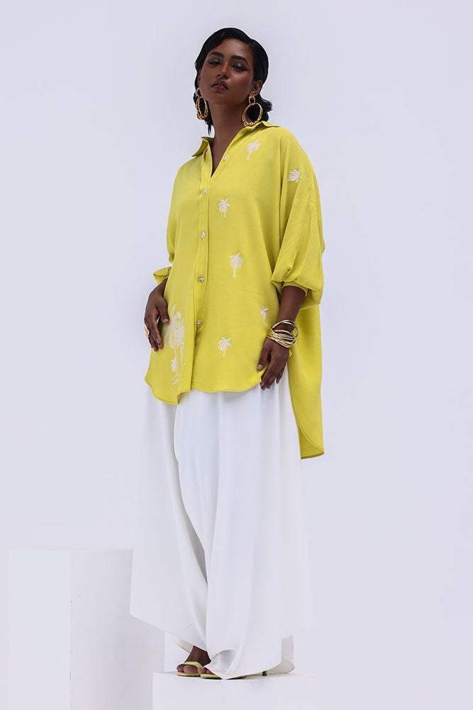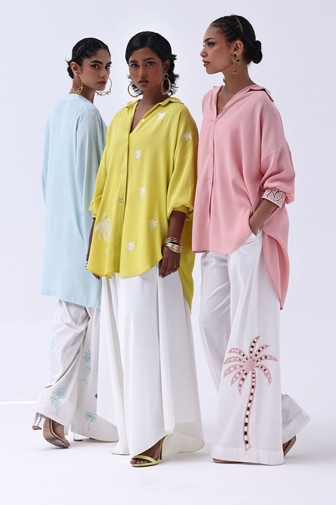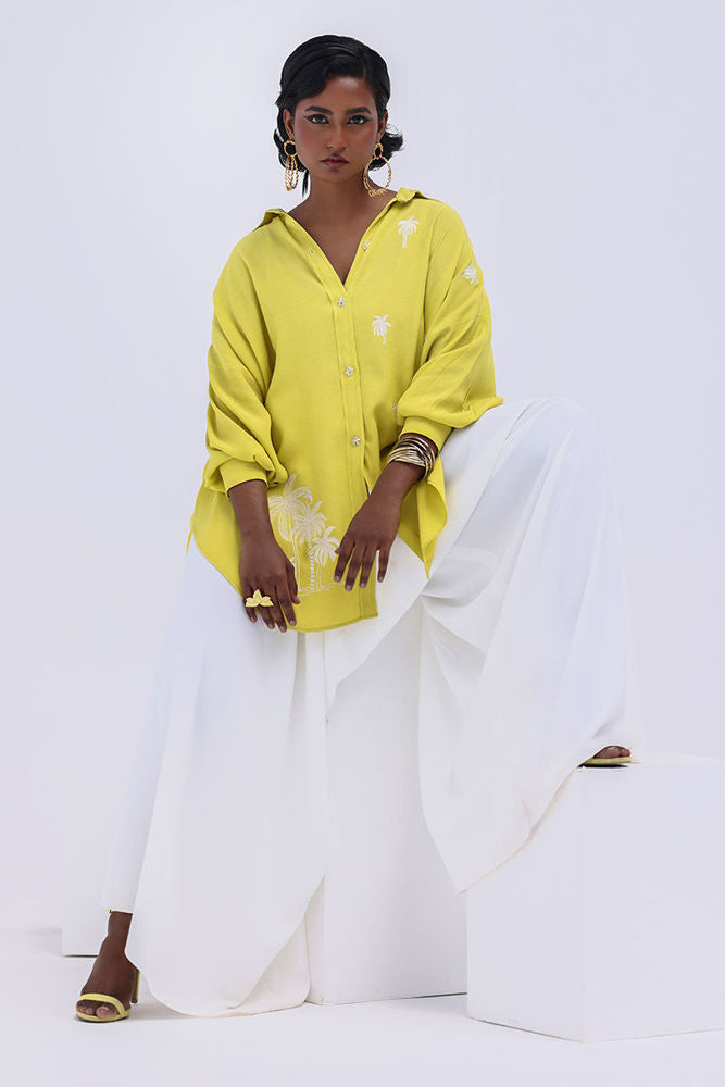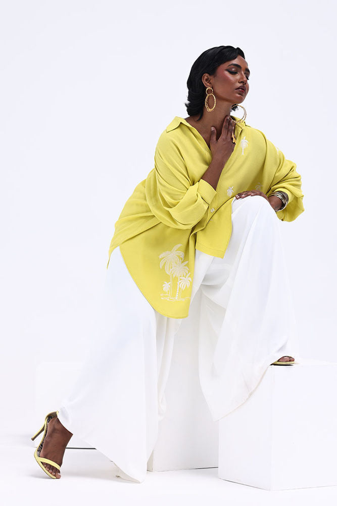 Fresh and graceful, this ensemble features a Celery Green Turkish Linen shirt paired with Ivory Turkish crepe pants for a look that’s both refined and modern. The shirt is beautifully accented with delicate Resham embroidery on the front, adding a subtle touch of artistry and texture. Lightweight and comfortable yet effortlessly elegant, this outfit is perfect for day-to-evening wear, exuding understated sophistication.