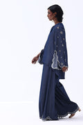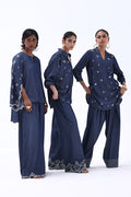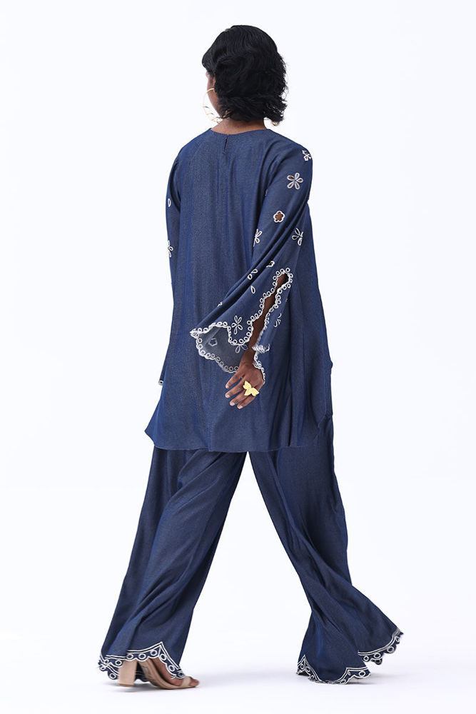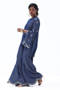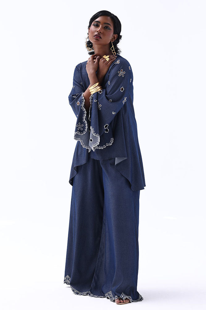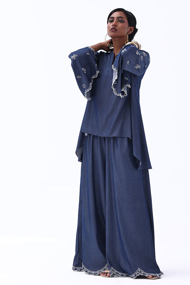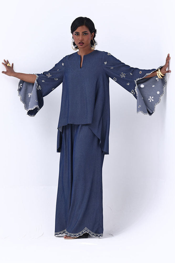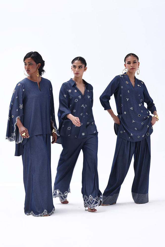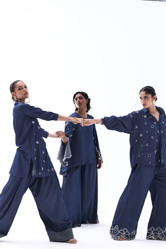Effortlessly stylish, this Dark Blue Tencil Denim ensemble pairs a tailored shirt with culottes for a modern, coordinated look. The shirt features delicate Resham embroidery with elegant cutwork on the sleeves, adding texture and sophistication. Paired with matching culottes adorned with Resham-embroidered scalloped hems, this set blends structure with femininity