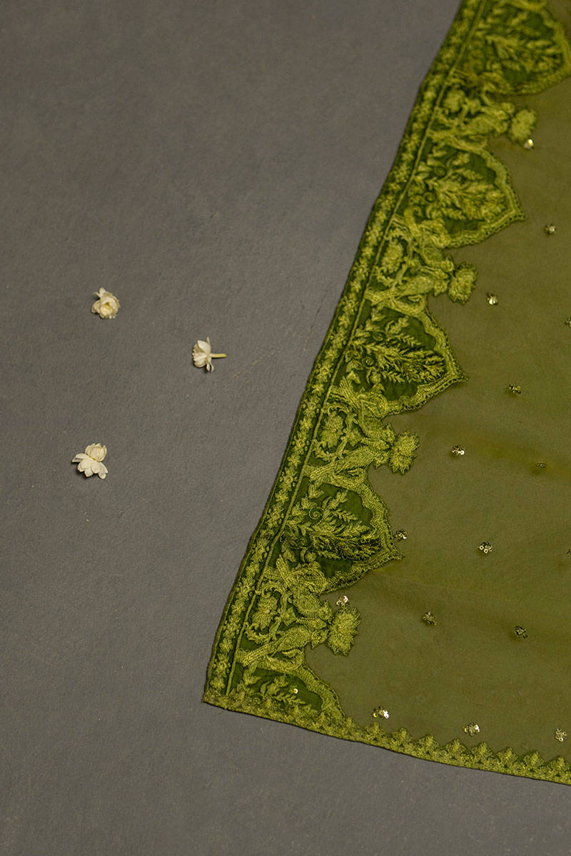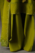 Sabah Bano flips the script on formalwear with a confident take on silhouette and color, all rendered in lush Zamurd Green that’s earthy, striking, and anything but shy. The long-sleeved shirt features tonal embroidery down the front, with tassel accents on the neckline and ornate lace edging at the hem adding movement and richness. The round neckline keeps it classic, while the full farshi shalwar with details on the pancha bring volume and ease. It’s finished with a sheer matching dupatta, adorned with scatter of sequins,plus embroidered borders that frame the whole look. This is quiet confidence stitched into something you can actually wear out.