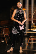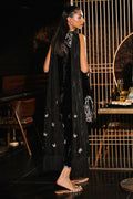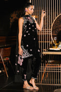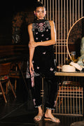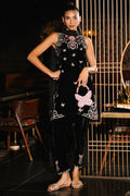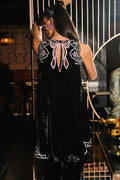Crafted in rich black velvet, this shalwar kameez showcases multicolored floral resham embroidery intertwined with delicate butterfly motifs. Intricate handwork adds a refined shimmer. The back of the kameez is elevated with elegant bow details and sheer organza appliqué. A luxurious silk dupatta with 3D butterfly embellishments and fringe finishing pairs beautifully with the coordinating shalwar designed with signature bow details.