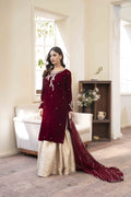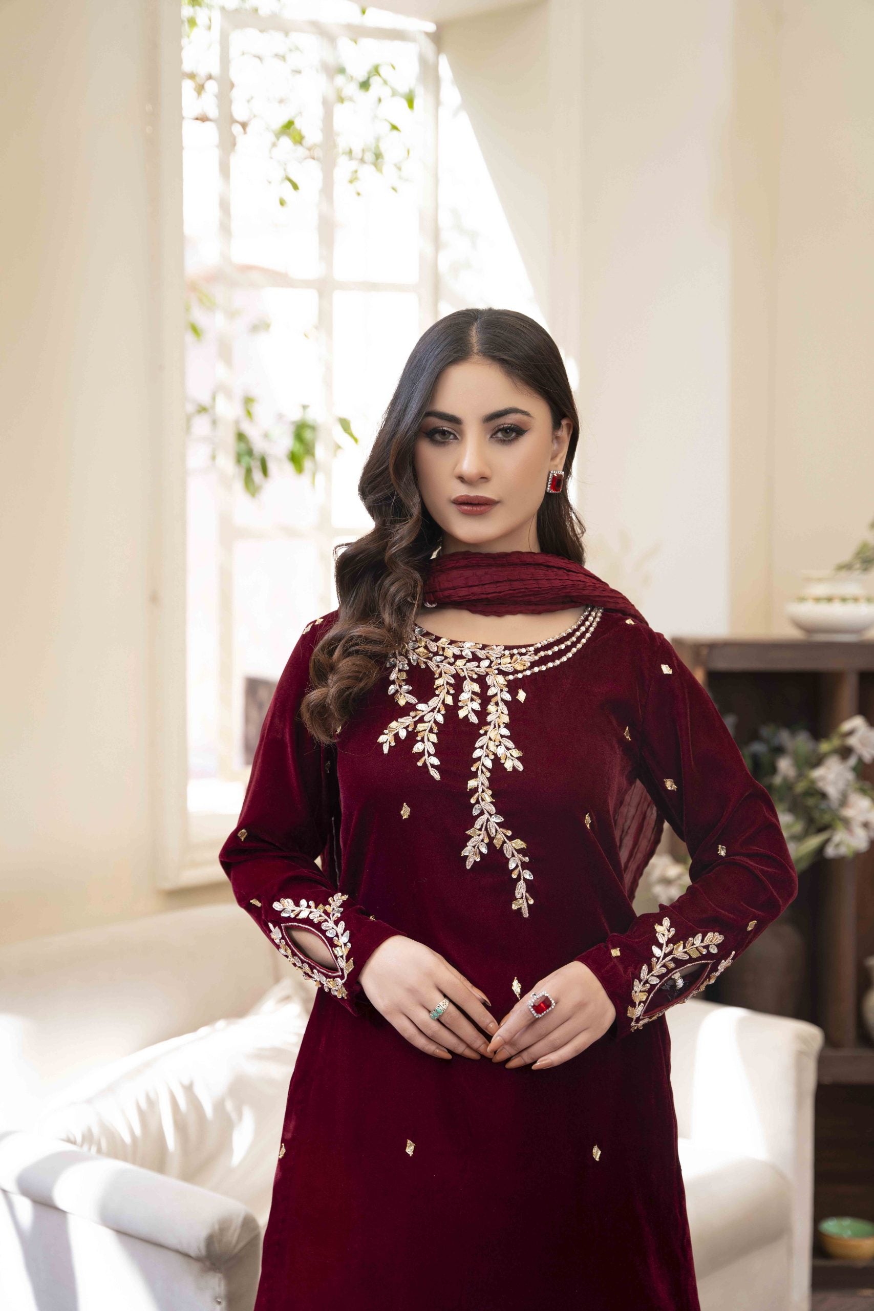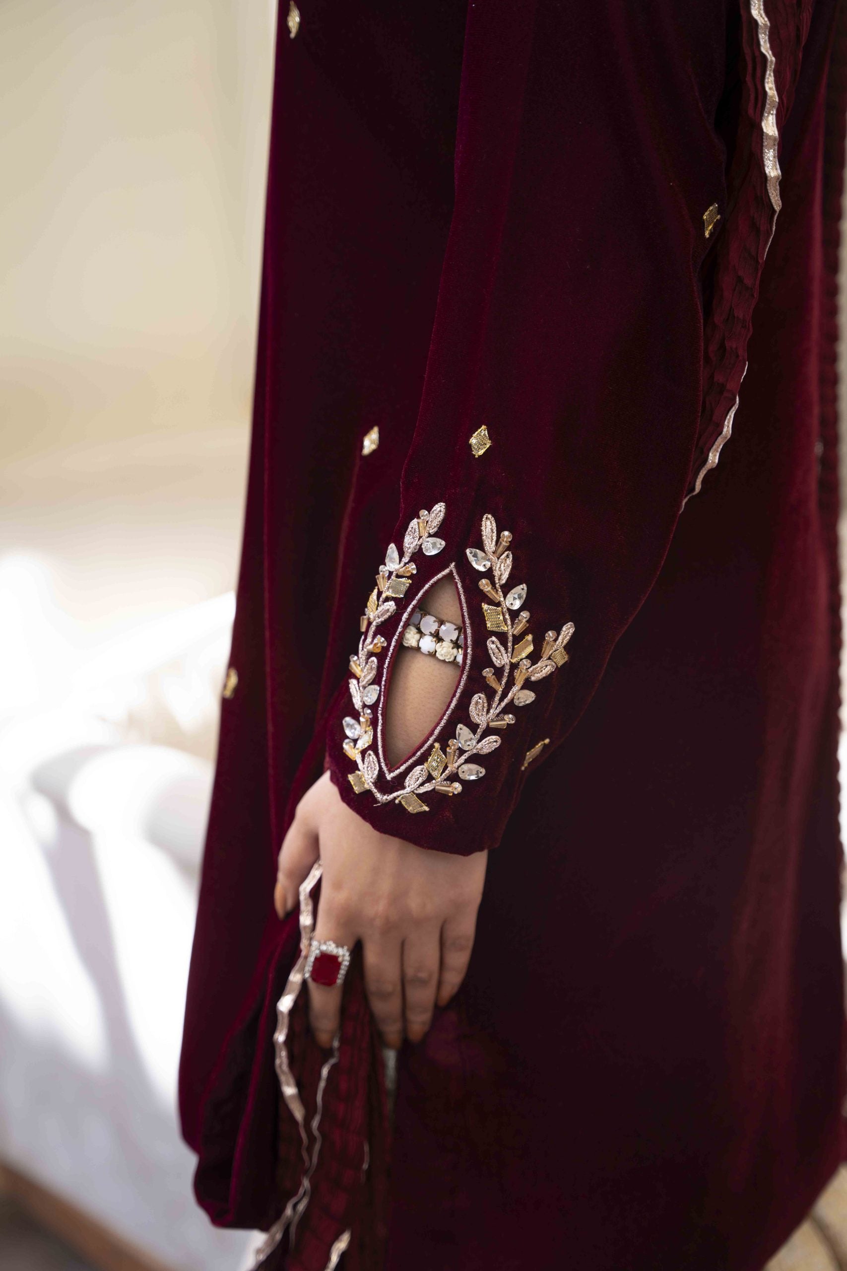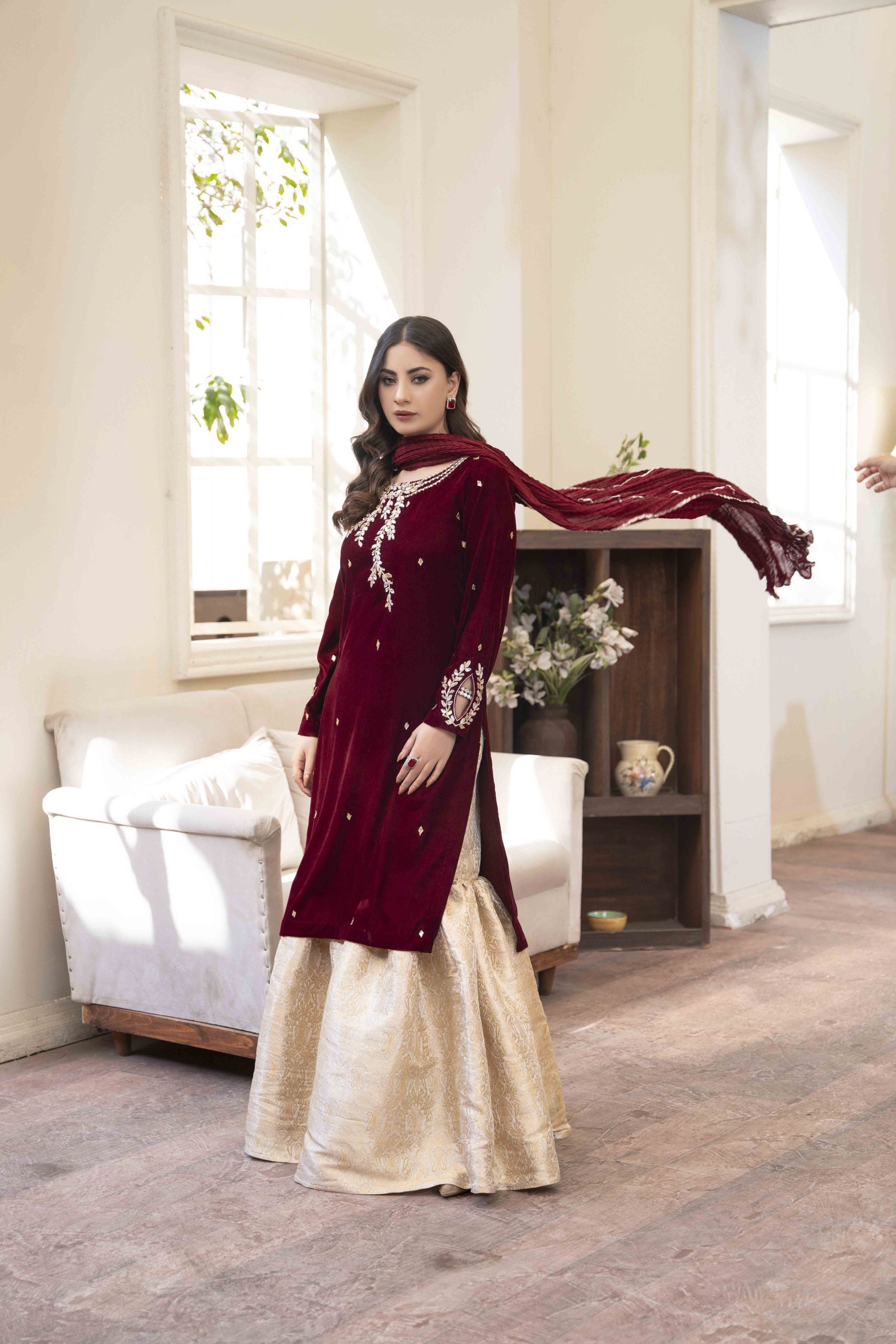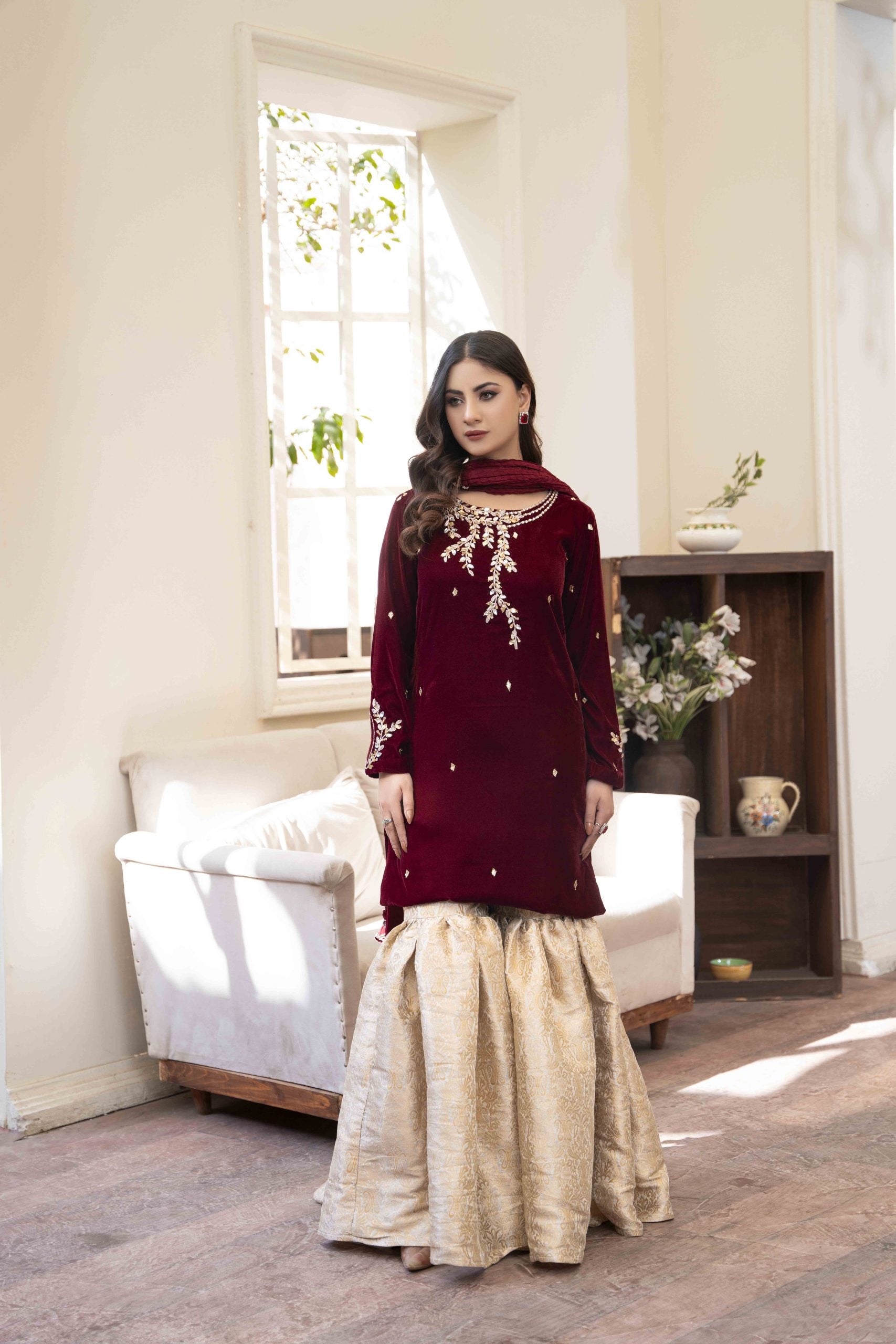 A beautiful maroon color velvet outfit has embelisshed on neckline and sleeves with gotta work and hand embroidery with stones and swarovski and crushed dupatta with gotta detailing on it. Jamawar gharara included.