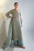 A head-turning powder blue long shirt in pure tissue, "Secret Swan" features intricate resham embroidery with delicate hand-embellished zardozi, dabka, and mukaish work. Bell sleeves and a side slit add a contemporary flair to the elegant silhouette. Paired with a matching blouse and flared silk pants adorned with stunning thread and handwork, the look is completed with a luxurious tissue dupatta featuring sitara chann and tila scalloped detailing. Perfect for weddings and festive occasions, this ensemble beautifully blends modern style with timeless allure.