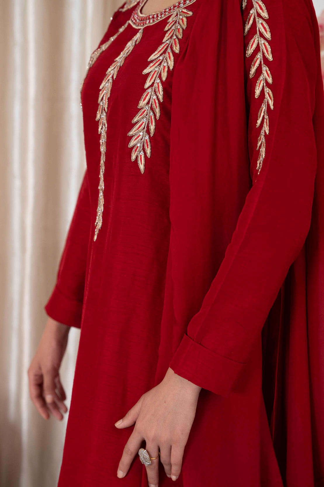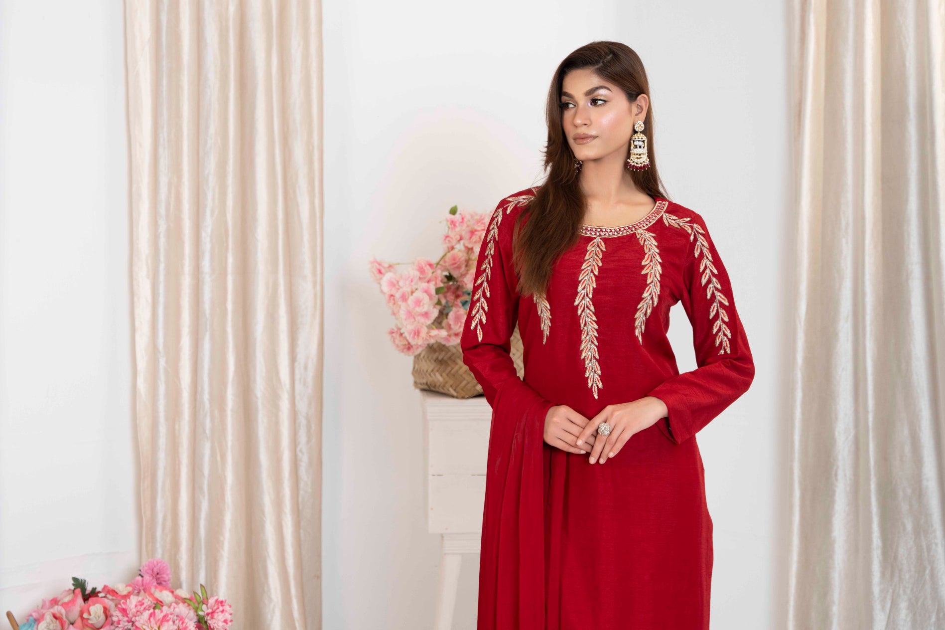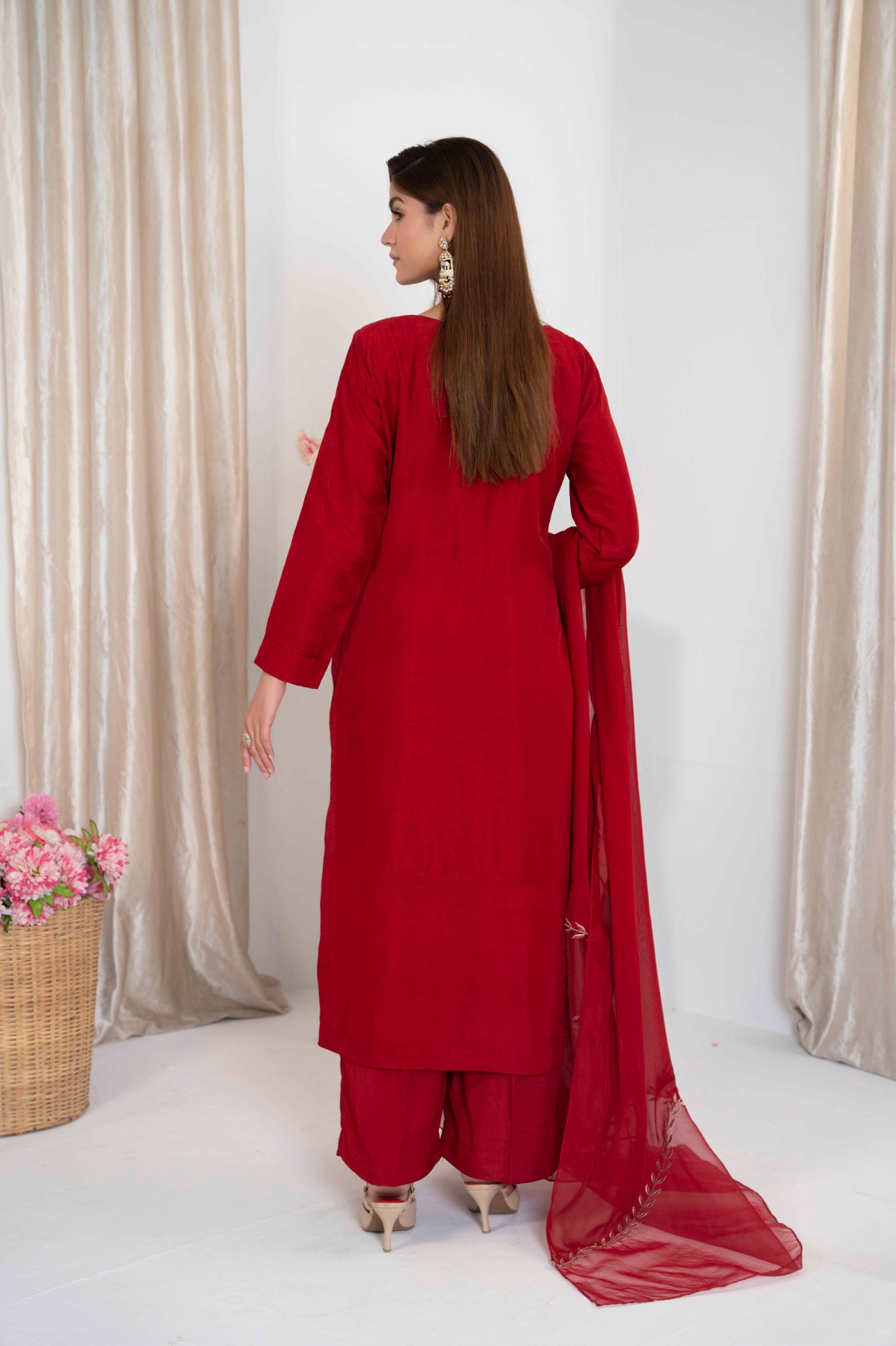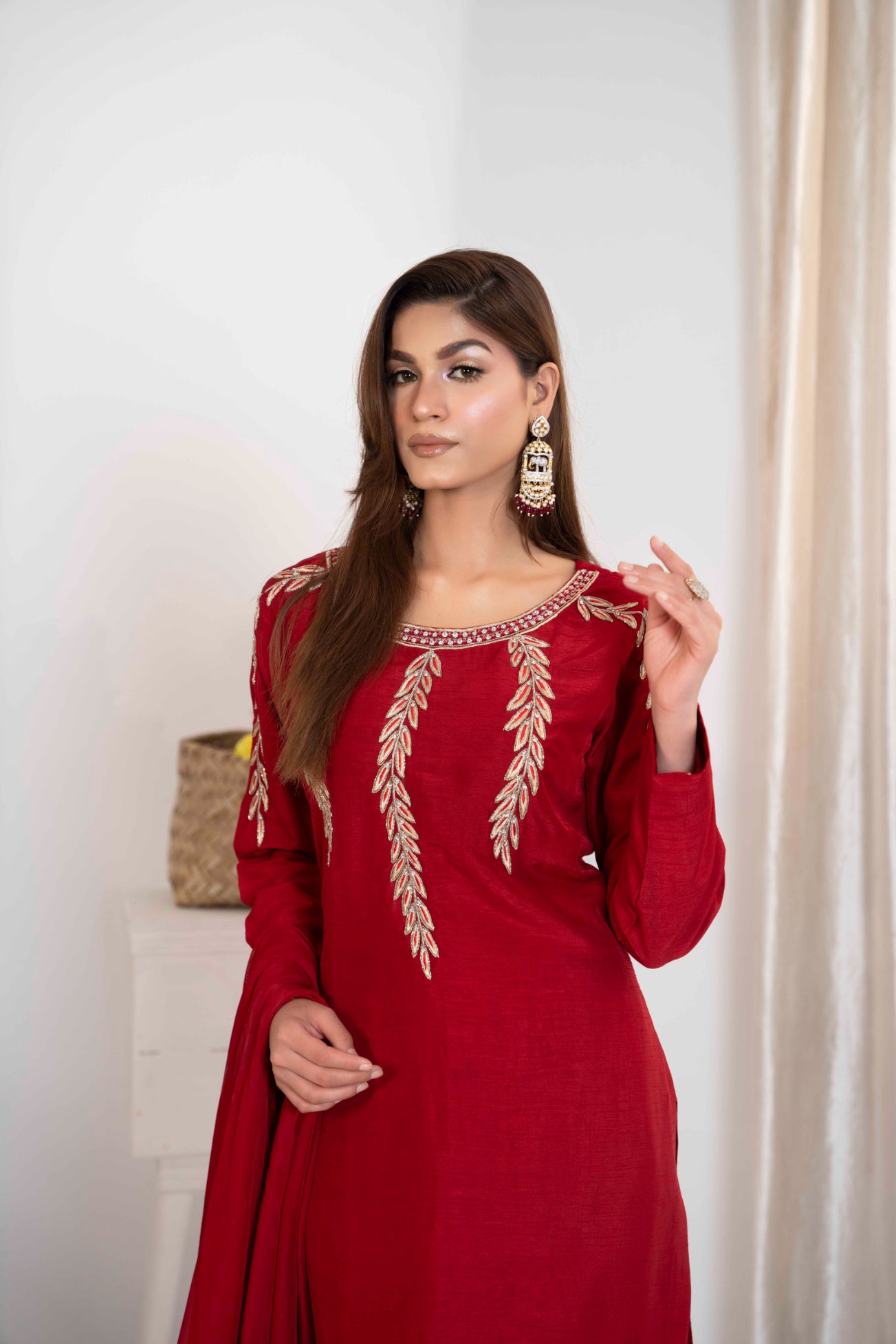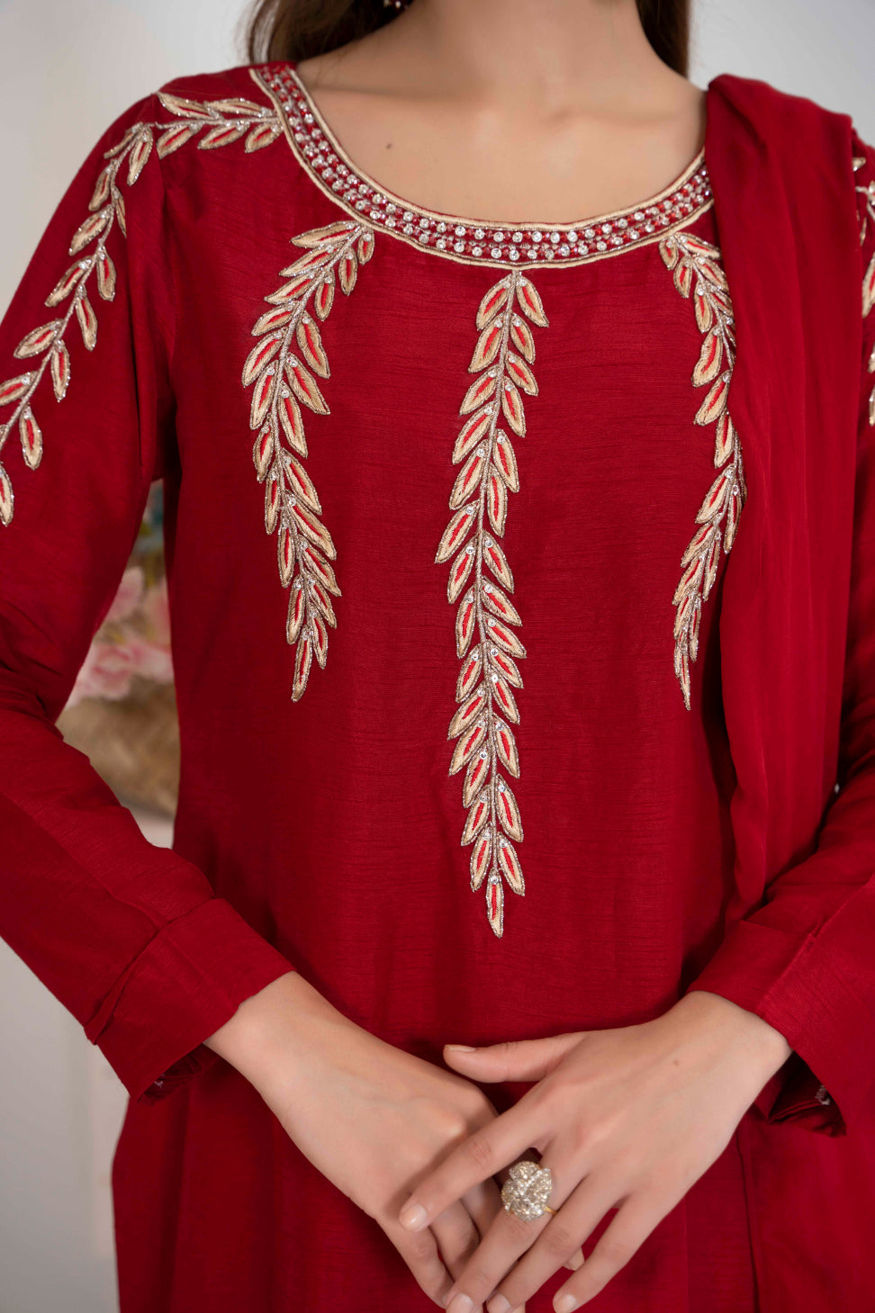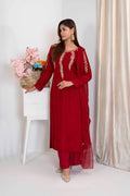 Introducing our luxurious pret in ravishing maroon! Crafted from Korean raw silk, exquisite hand embellishments and tilla work on it, elevating every details to perfection. Paired with straight trousers and embroidered silk dupatta.