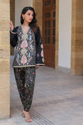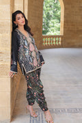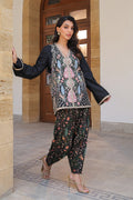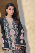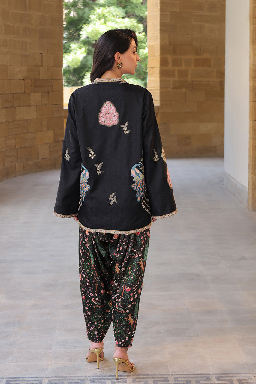 An ebony self jamawar jacket unfurls in a tapestry of blush, sage, and muted gold florals, enriched with intricate aari embroidery, applique, and baroque inspired motifs across the front and sleeves. The relaxed silhouette, traced with gilded edging, pairs seamlessly with a shalwar in matching printed charmeuse, patterned with folkloric artistry for a quietly decadent finish.