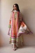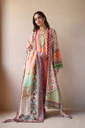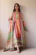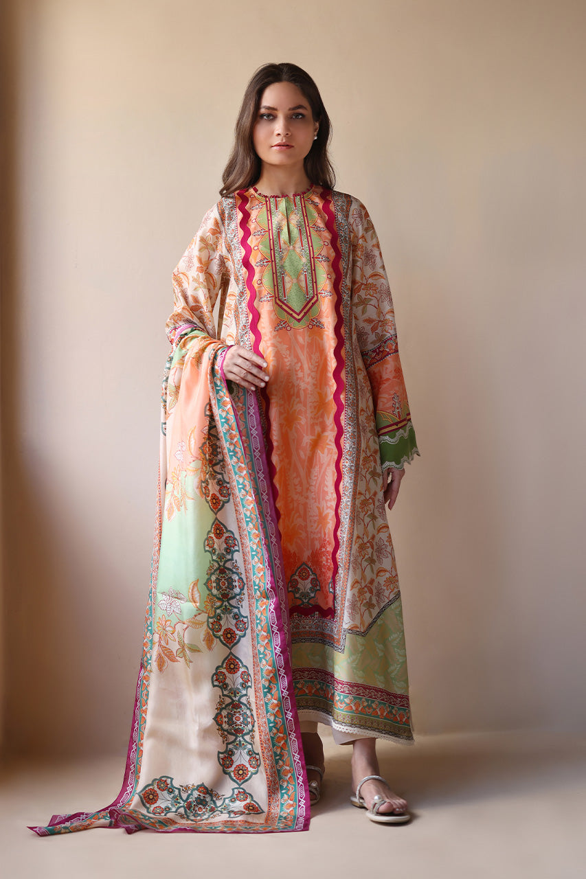 A classic silhouette is adorned with a sunlit apricot and verdant sage print, framed with intricate floral accents and scalloped crimson 3D detailing. The khaddi silk shirt is paired with pure rawsilk culottes and a cascading medium silk dupatta, exuding timeless charm.