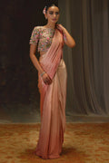 A fluid blend of romance and artistry, this Setareh saree is spun from luminous pure silk in an ombré wash of blush and peach that flows like a painted dawn. The blouse is a treasure of craftsmanship—hand-embroidered with French knot roses in bloom, The back is an alluring lattice of cutwork, finished with beaded tassels that sway with every movement.