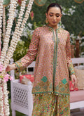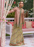 A true head-turner this season, this ensemble is a celebration of color, craft, and charm. You simply can’t take your eyes off it. This stunning outfit features a hand-blocked ivory lehenga and short pink jacket, brought to life with vibrant shades of mint, kiwi green, and accents of bright fuchsia. Each hue dances beautifully across the fabric, creating a visual symphony that feels both refreshing and bold. The short jacket is exquisitely embellished with traditional sitara, zardozi, kora, and dabka work along with appliques in aqua and kiwi, each element painstakingly applied to add dimension and a luxurious finish. It strikes the perfect balance between heritage detailing and contemporary flair. The matching ivory dhaka features coordinated hand-blocked patterns, grounding the vivid color palette with elegance and cohesion. Flowing yet structured, it enhances the overall silhouette with poise. The look is completed with a hand-blocked dupatta in tones of pink and kiwi, delicately adorned with intricate handwork and edging that adds depth, texture, and an irresistible pop of color. This ensemble is ideal for festive celebrations, mehndi events, or summer weddings, wherever you want to make an unforgettable impression. With its joyful color story and opulent craftsmanship, it’s the perfect blend of tradition and trend, ensuring you radiate grace and confidence all day long.