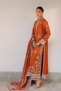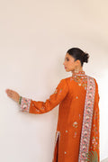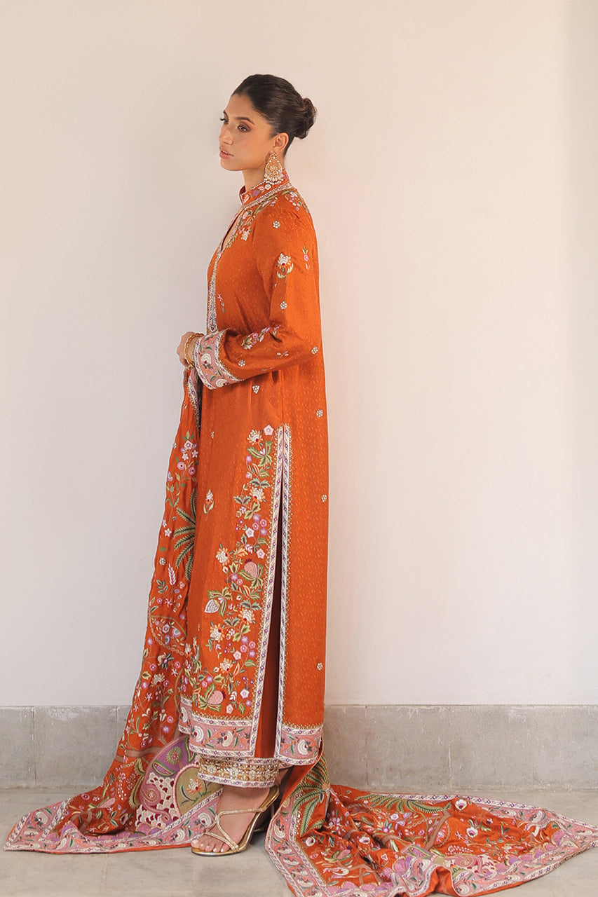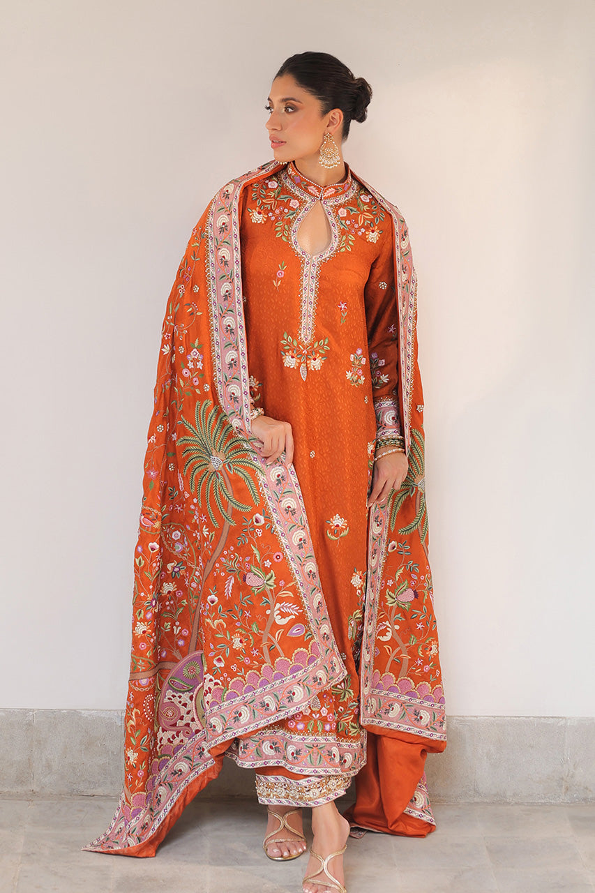 A gilded burnt orange canvas sets the stage for this A-line kurta, cut from lustrous self jamawar and framed with artisanal hand embroidered resham florals, sequins, and applique along the neckline, cuffs, and hem. It is paired with pure rawsilk izaar, their hems richly embroidered and kissed with shimmering sequins. The statement self jamawar shawl captivates with a botanical tapestry of birds, tropical palms, and floral sprigs, all intricately rendered in aari embroidery, an ode to heirloom romance reimagined with modern ease.