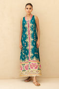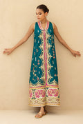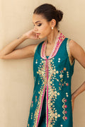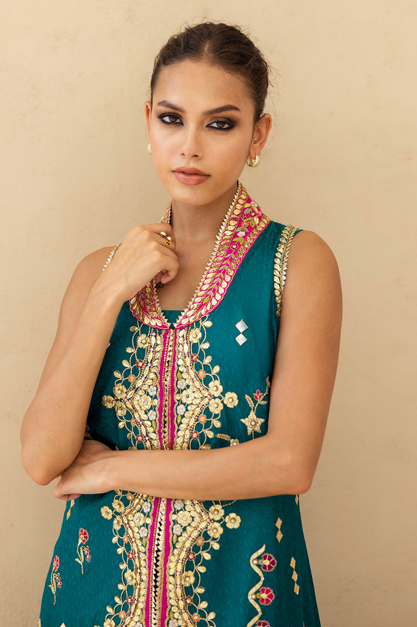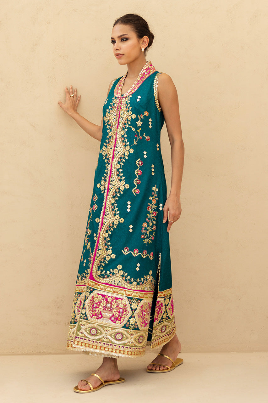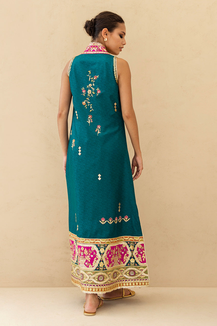 A sleeveless front open jacket in a rich emerald hue exudes vintage charm with intricate zardoze work, gota and resham embroidery that trails down the front like a jewel studded tapestry. Bold appliqué details in magenta and sage anchor the hem creating contrast and depth while the mandarin neckline adds a modern touch to the otherwise timeless design. Paired with matching pure rawsilk izaar featuring gota work.