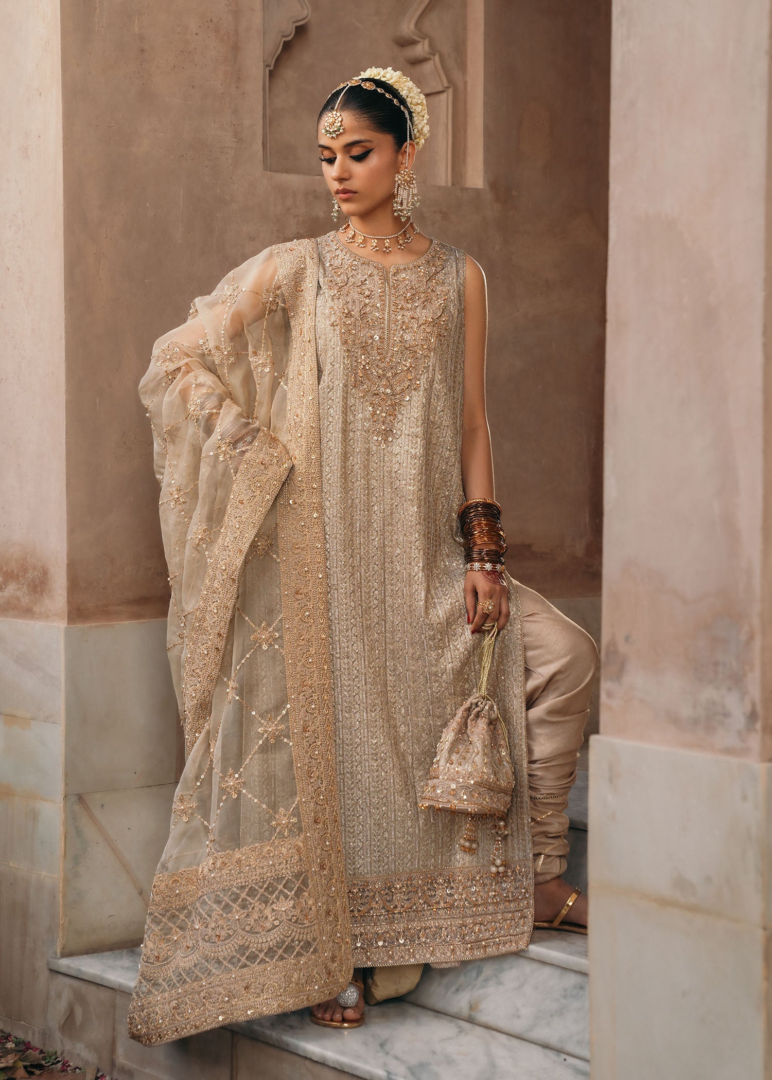 Subtle shimmer meets timeless grace in this Mocha Embroidered Set, designed in a soft greyish-brown hue that speaks understated luxury. The shirt is cut from a shimmery, embroidered fabric, with a heavily embellished neckline that adds a refined touch of detail and depth. Paired with a classic churidar pajama and a sheer, flowing organza dupatta, this three-piece look is perfect for evening soirées, formal dinners, or any occasion where quiet elegance is key. The mocha tone brings warmth and versatility, making it a graceful staple for your festive wardrobe.