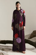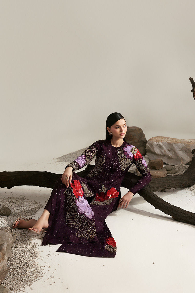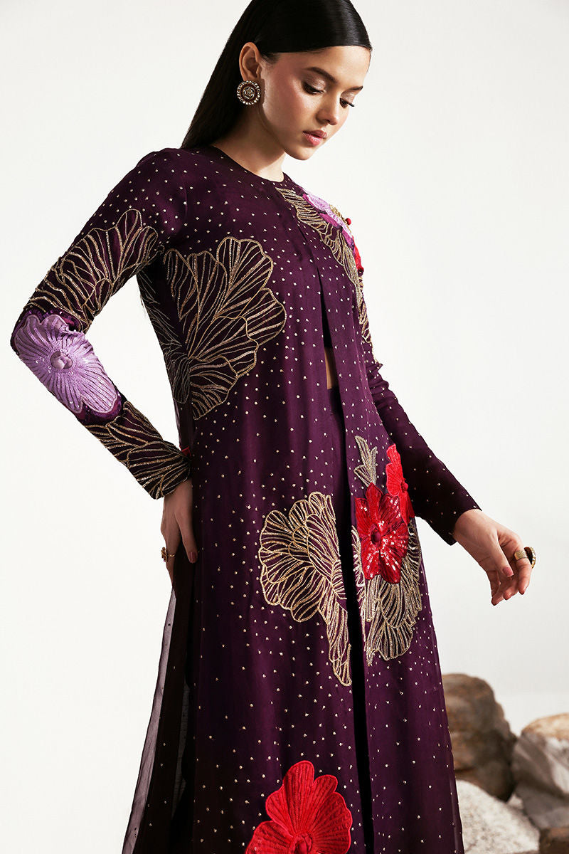 This elegant purple outfit combines a katan organza blouse with raw silk azar, creating a refined balance of luxury fabrics and graceful design.