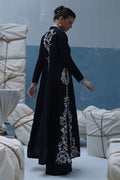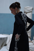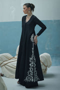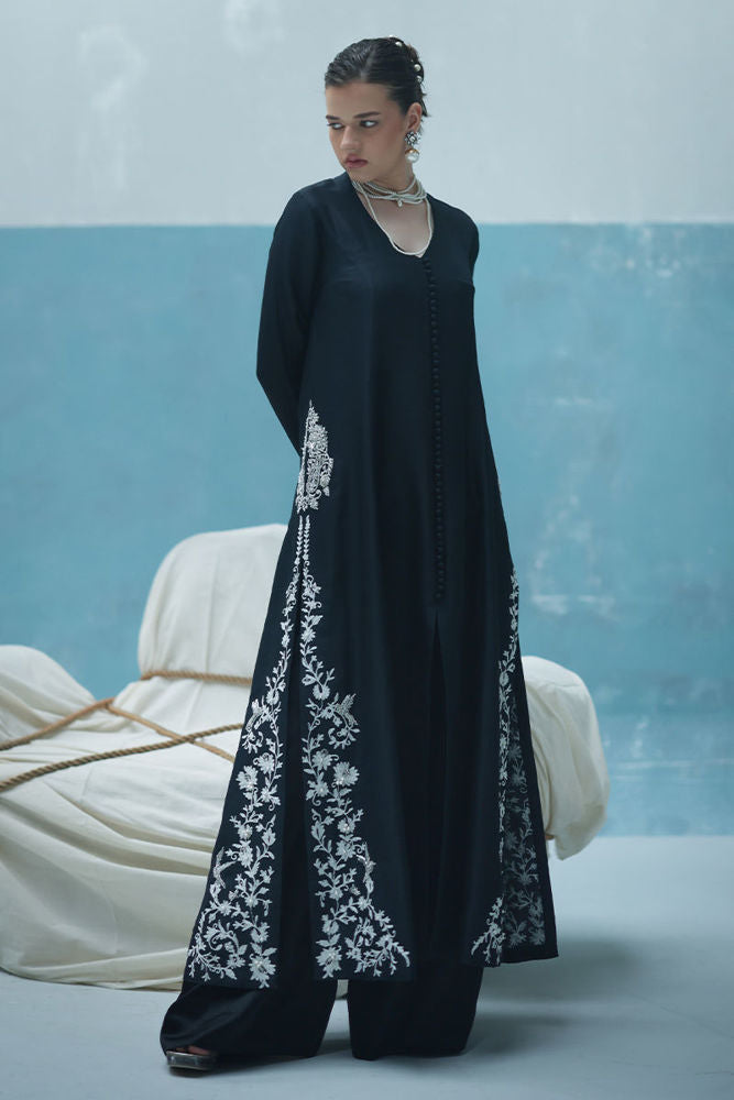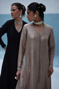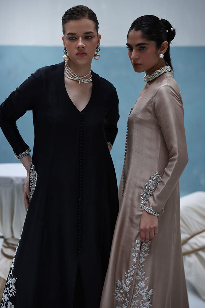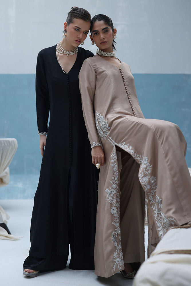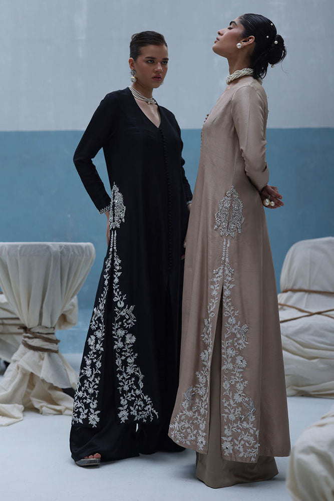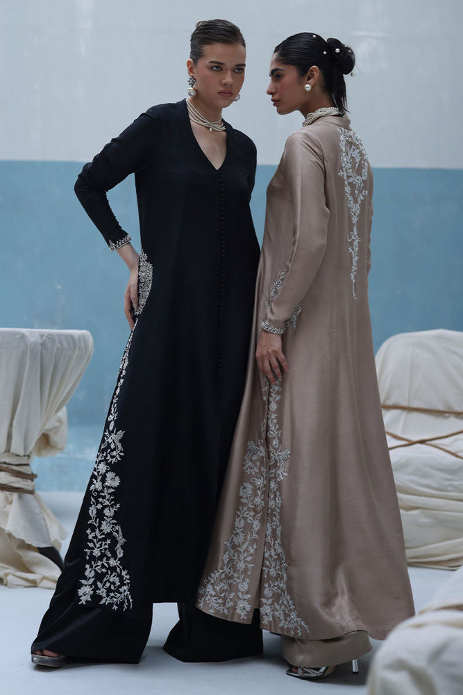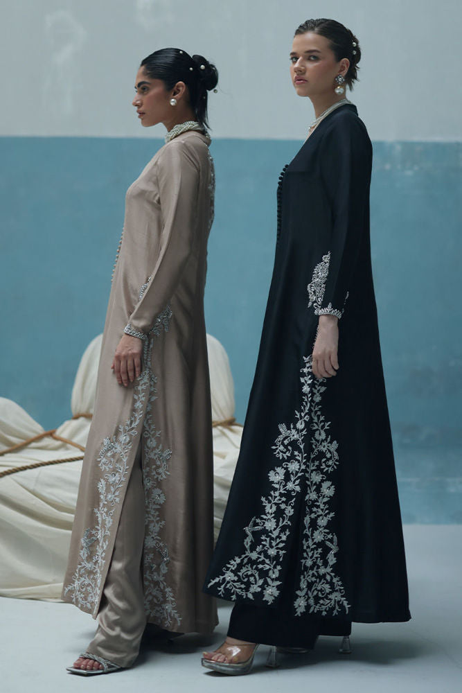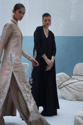 A graceful ivory outfit featuring resham ari work, hand-embroidered with dabka, pearls, sequins, tikki stones, cutdana, and nakshi. The front-open shirt with a Prince panel cut pairs elegantly with shimmer crepe culottes—blending tradition with modern charm.