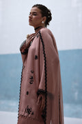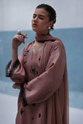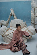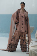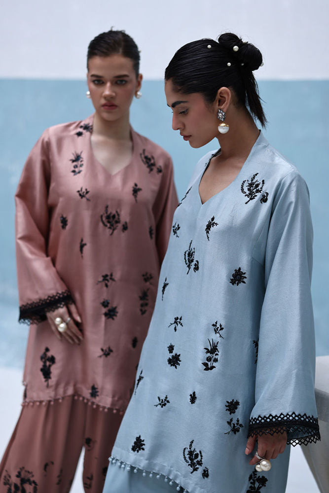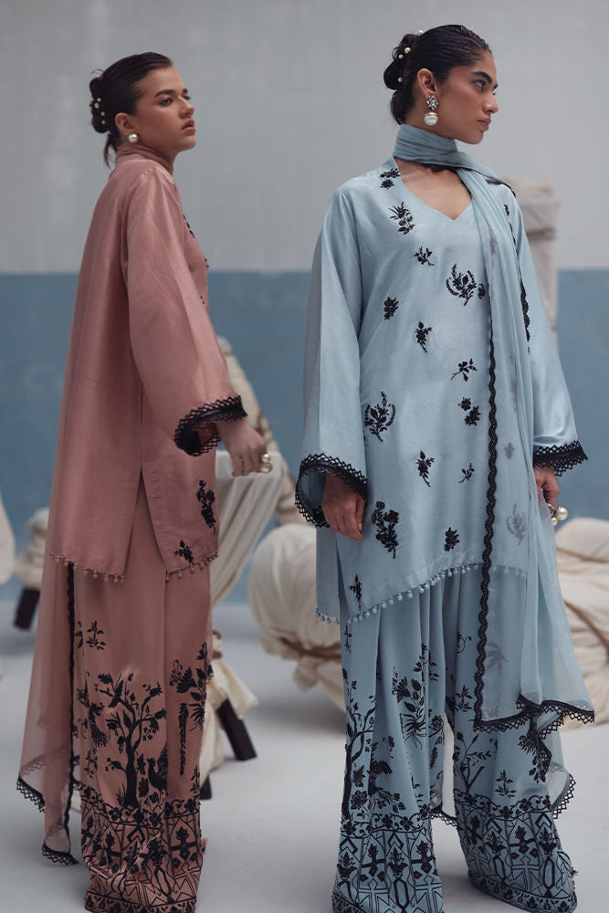 Loose-cut pure raw silk kurta with all-over screen-printed bunches, adorned with handwork of cutdana, crystals, moti, sequins, and 3D flowers. Paired with crepe silk Farshi shalwar featuring screen print and hand embellishment, and a crinkle chiffon dupatta finished with lace on all four sides.