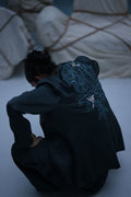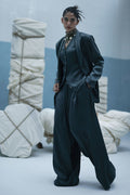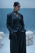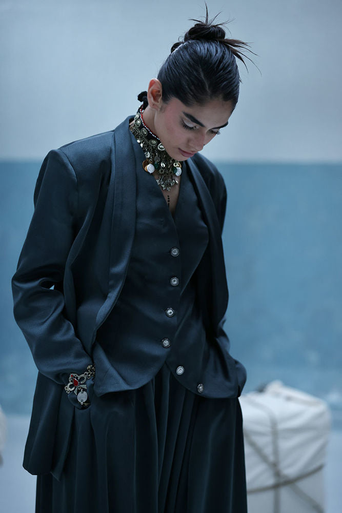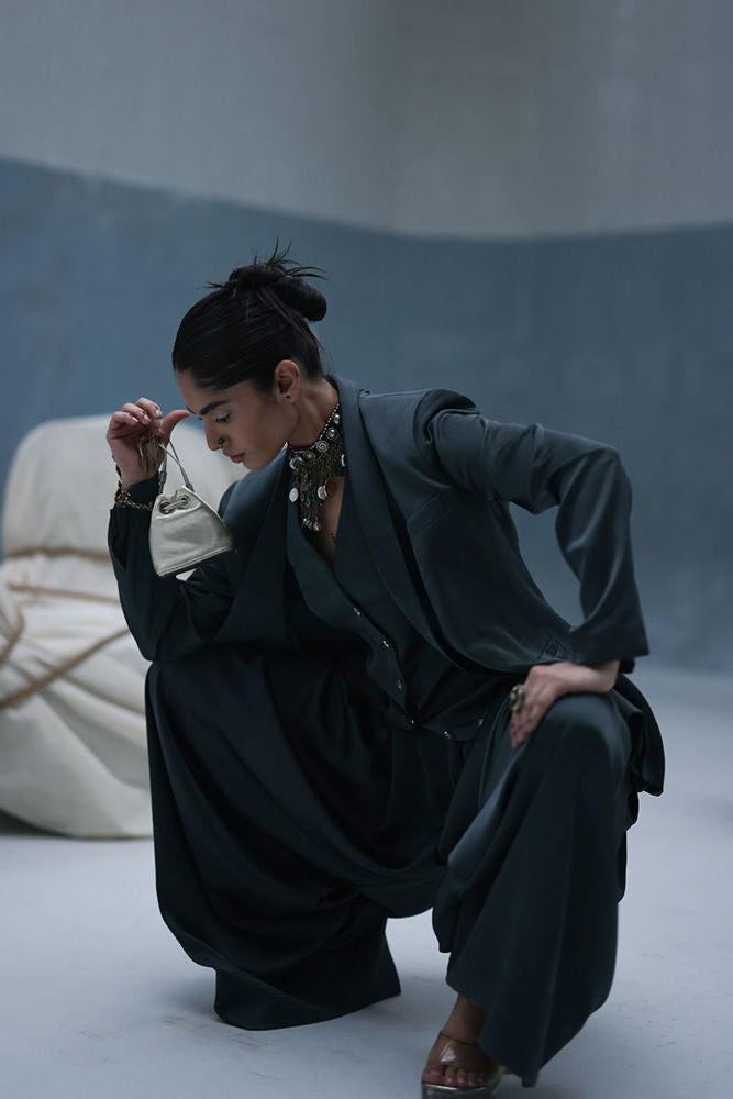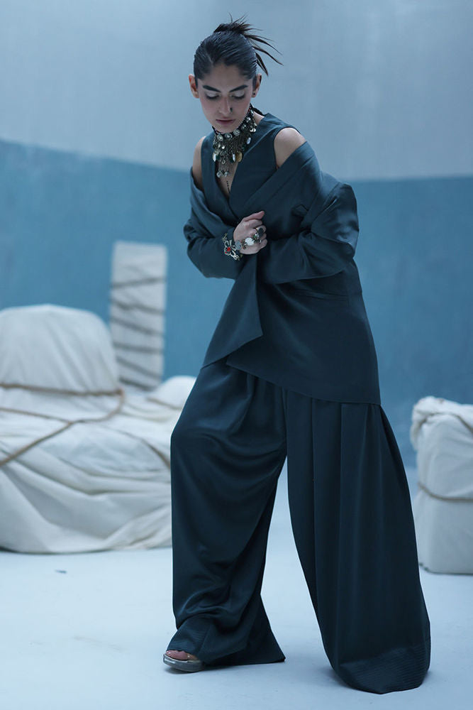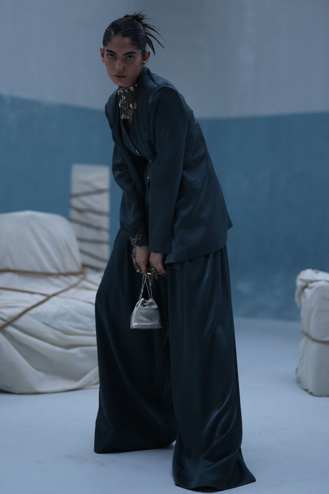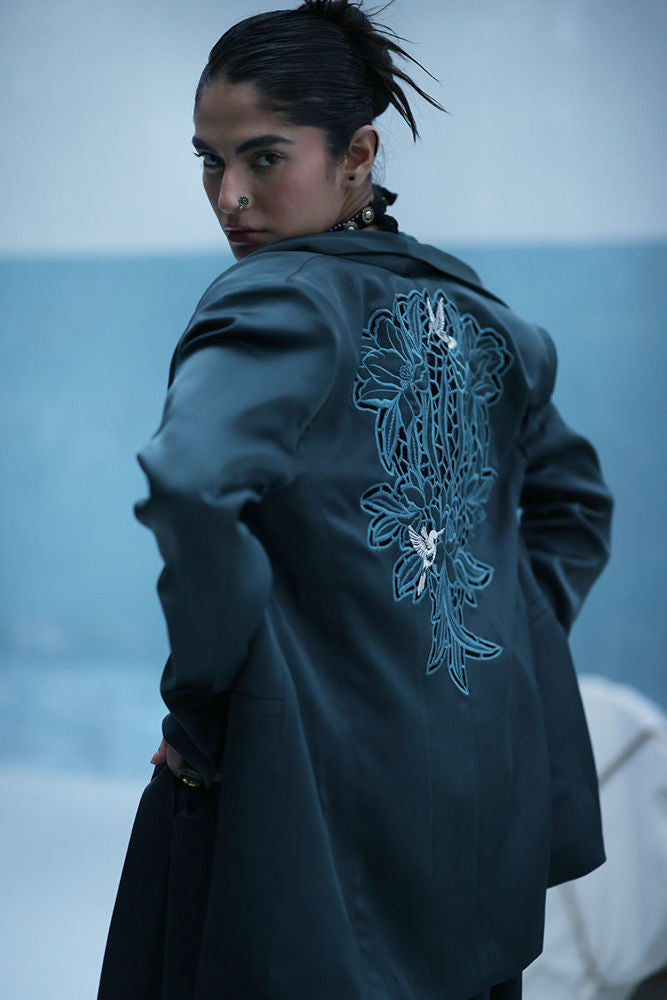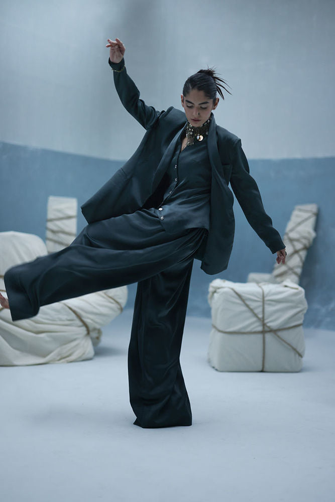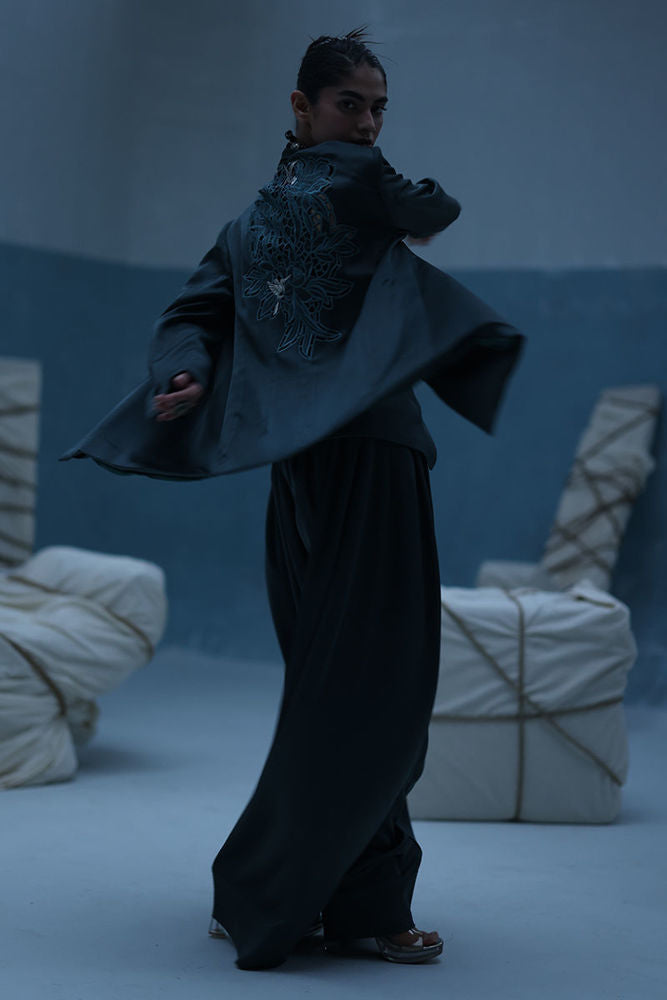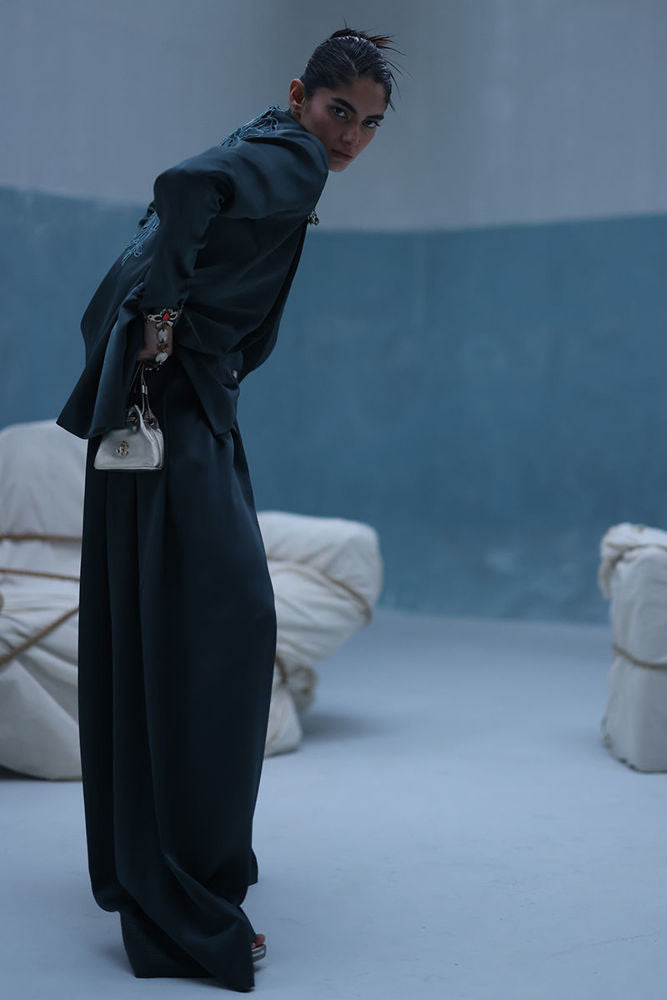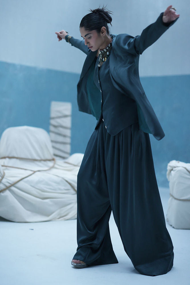 Poison green blazer suit with Farshi culottes in textured silk, featuring self-embroidery and cutwork at the back. Paired with embroidered crinkle silk, adding depth and detail to the look.