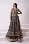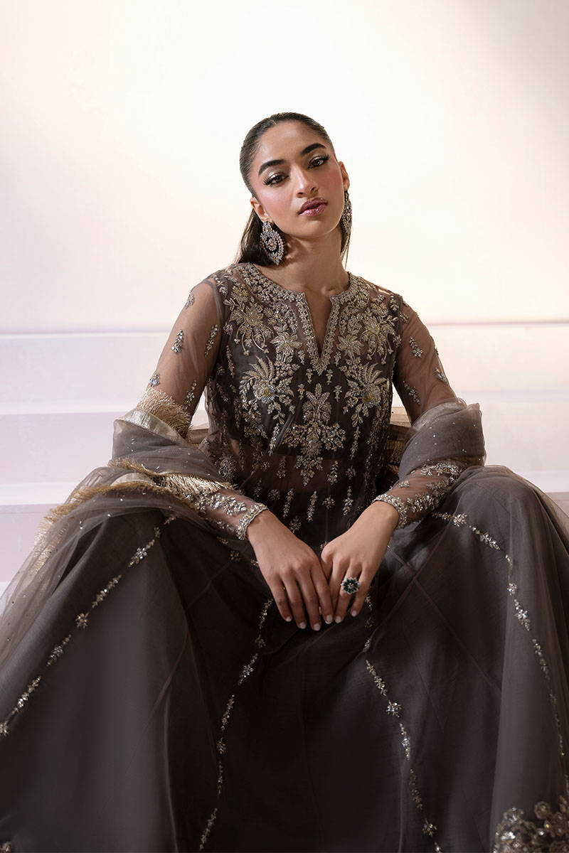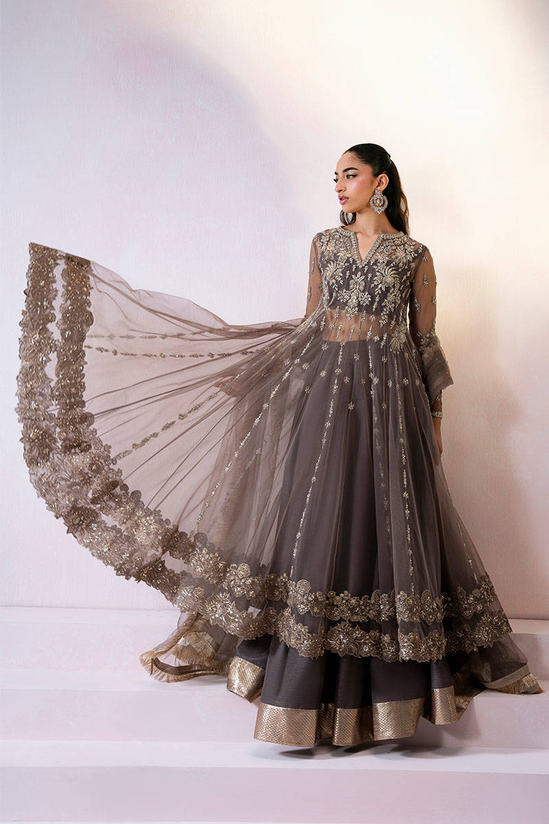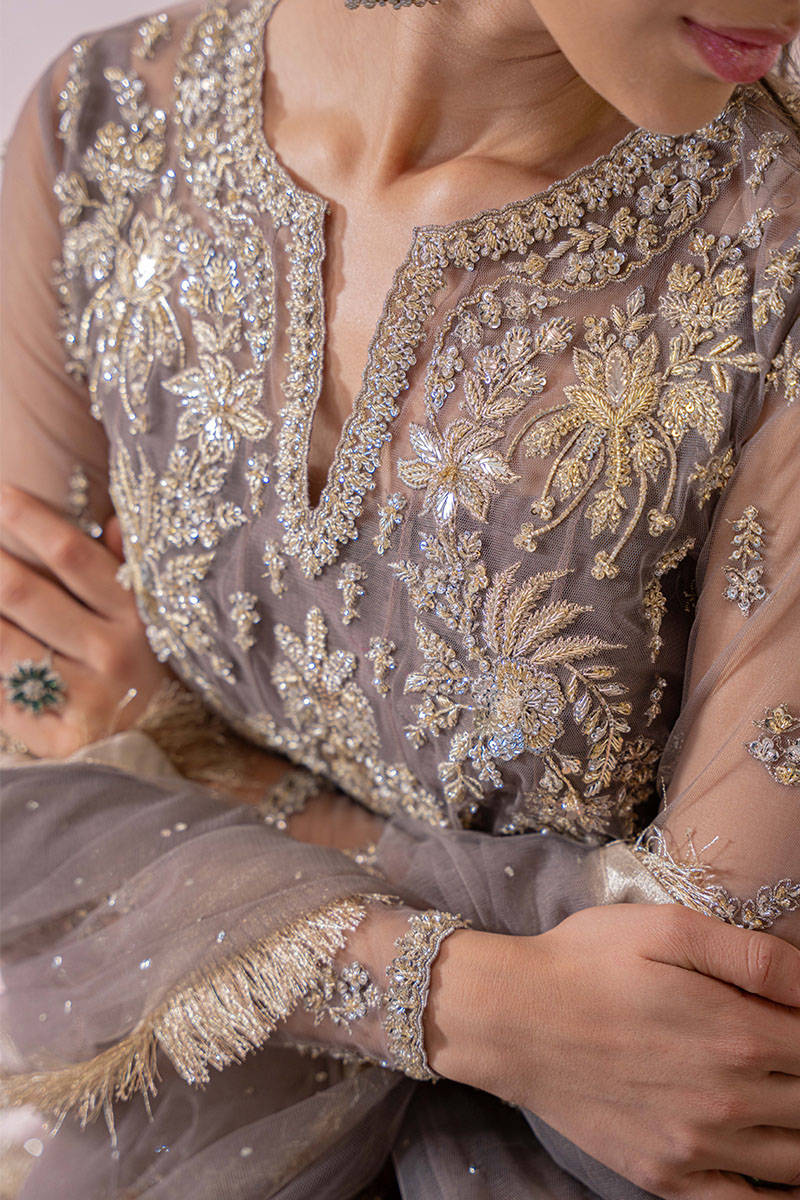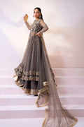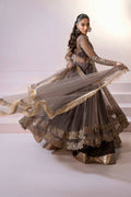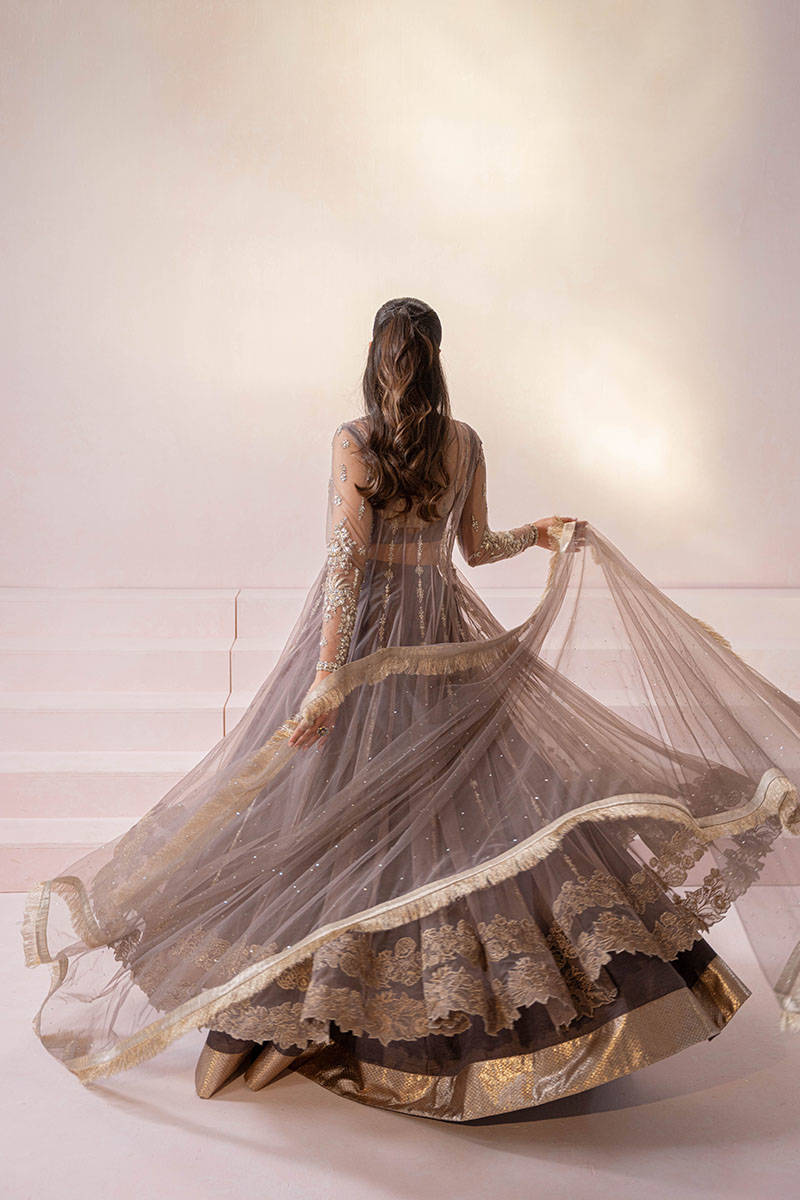 Starlight is a breathtaking grey net kalidar, featuring a delicately hand-embellished bodice, embroidered panels, and intricately detailed hem borders. Fitted sleeves with embellishments add a touch of elegance, while the raw silk inner blouse and lehenga in the same hue give the outfit a graceful, flowy silhouette. Finished with a golden lappa border for added richness and paired with a net mukaish dupatta adorned with classic kiran edging, this ensemble is perfect for any festive celebration—striking the perfect balance between tradition and ethereal charm.
