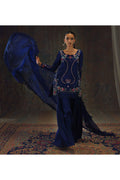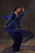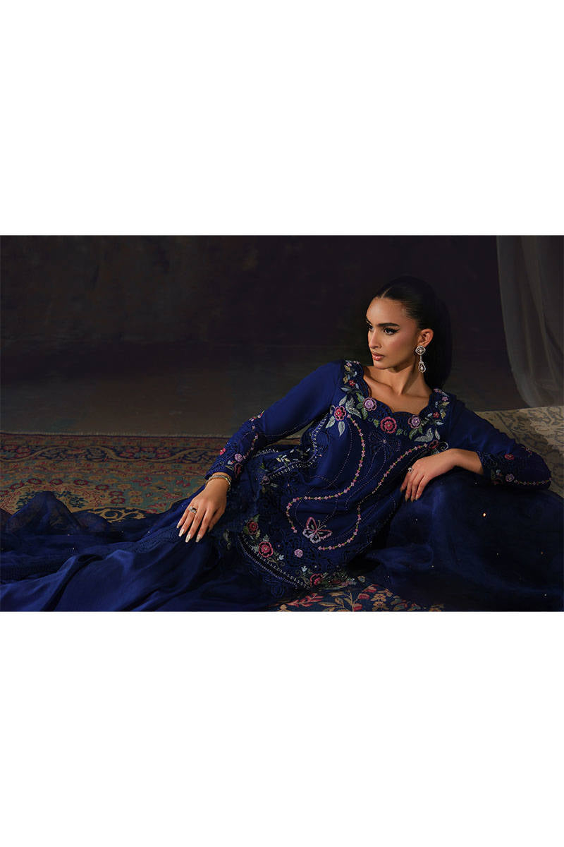 Bathed in the richness of midnight blue pure silk, this Setareh ensemble is a symphony of floral romance and delicate whimsy. The neckline and panels are adorned with intricate hand embroidery—lush roses, trailing vines, and tiny blossoms—interlaced with beaded garlands and charming bow motifs. A beaded butterfly rests gracefully at the hem, adding a playful yet refined touch. Paired with an organza dupatta and flared pure raw silk pants for a modern elegance.