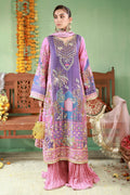 A long printed kurta paired with crushed dhaka bottoms, finished with a round V neckline and bell sleeves. Embellished with silver-gold kaam including gota, dabka, tiki stones, sequins, moti, and cutdana. Styled with a printed dupatta with light handwork.