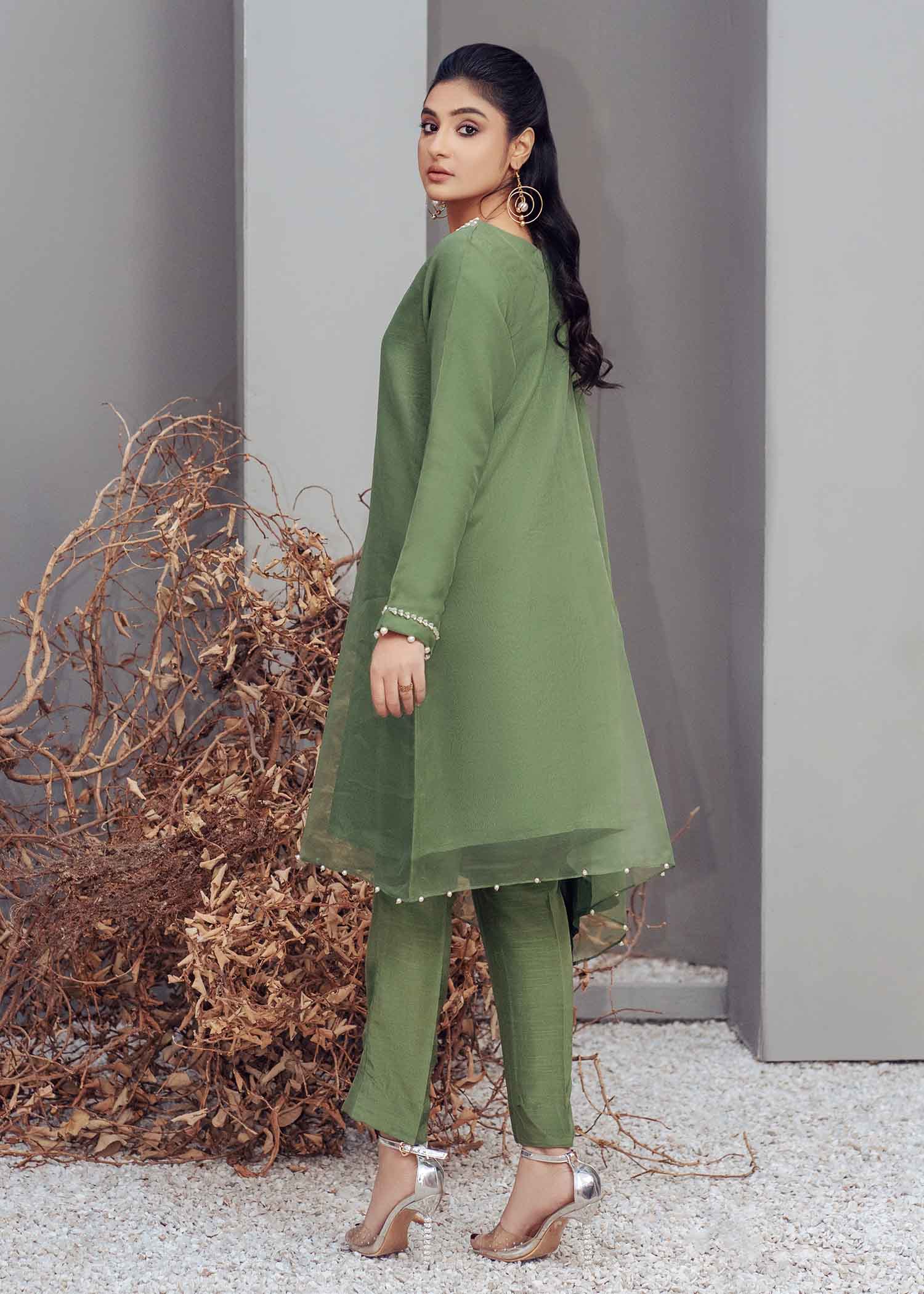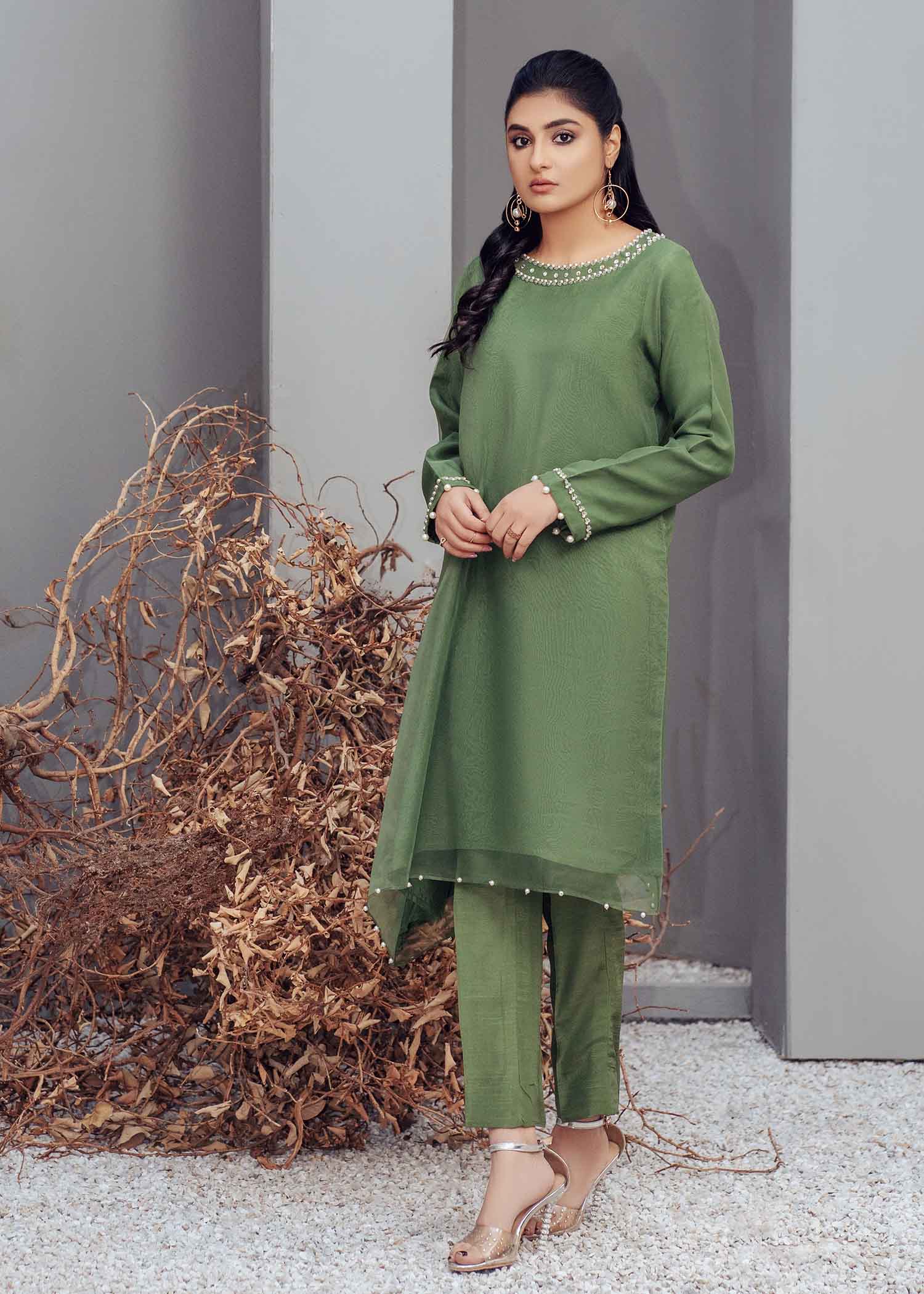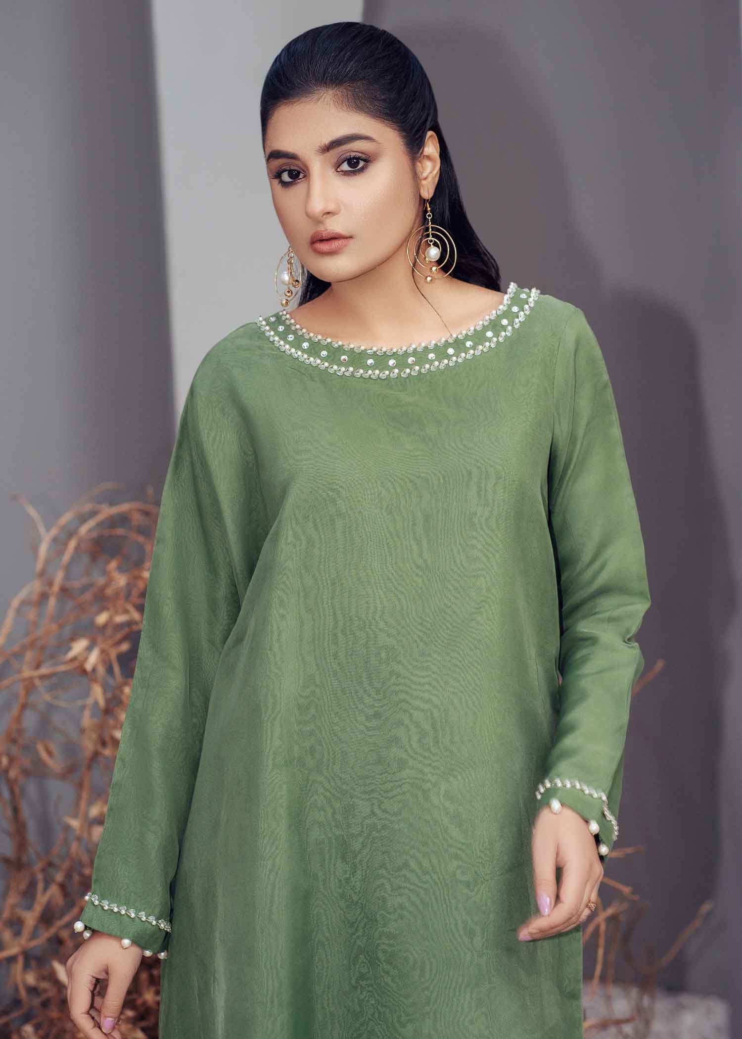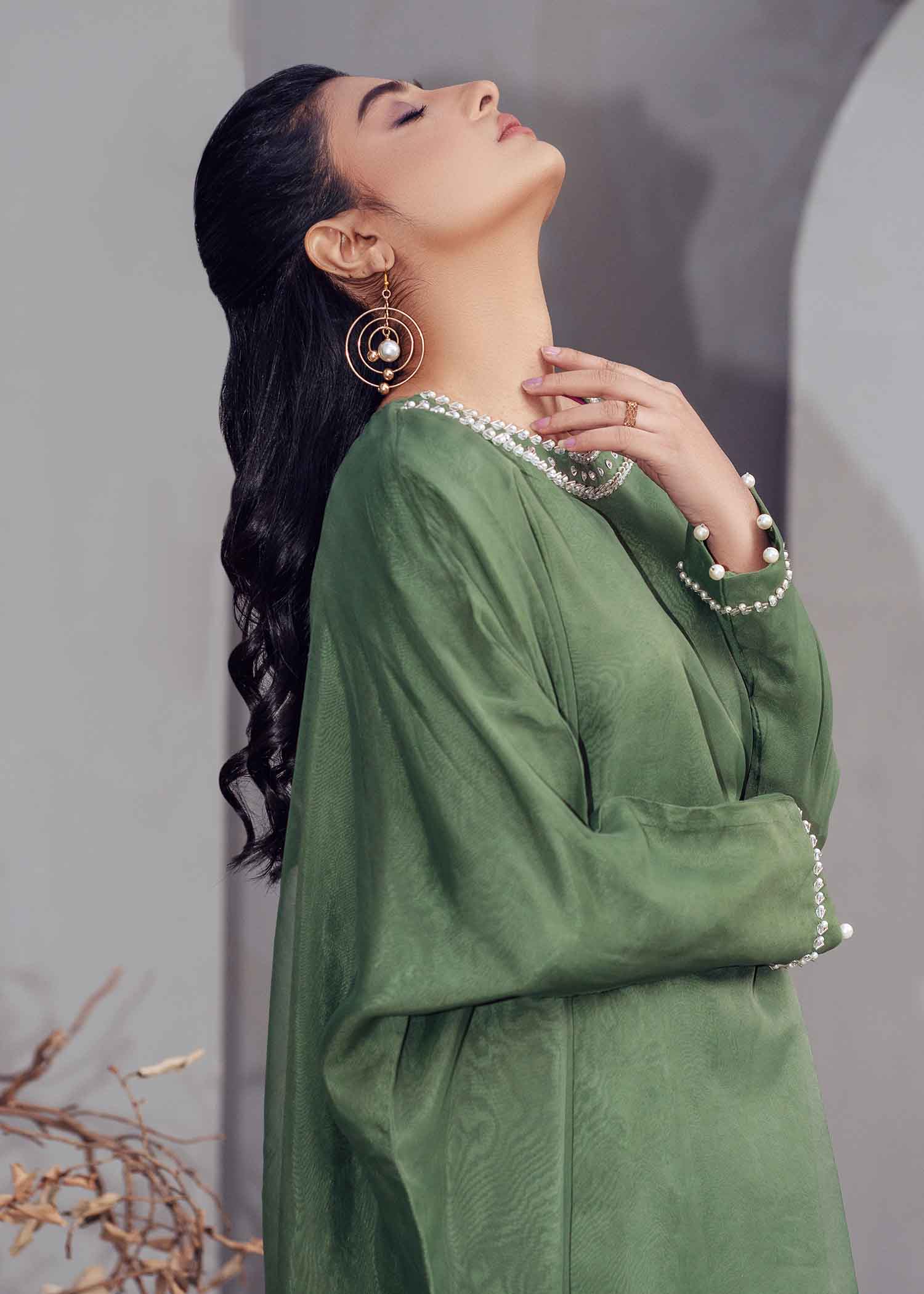 Description: An emerald green organza shirt neckline embellished with crystals details and pearls along the sleeves; paired with a matching raw silk straight pant