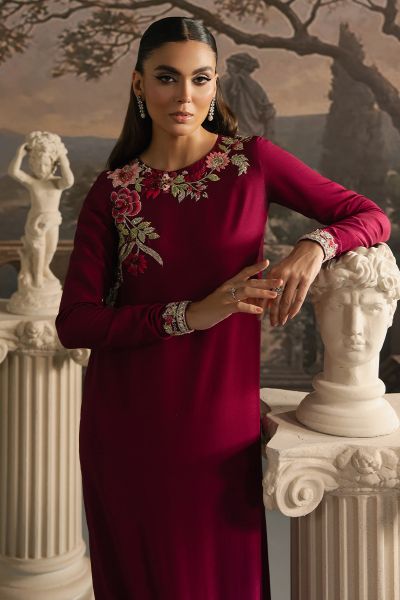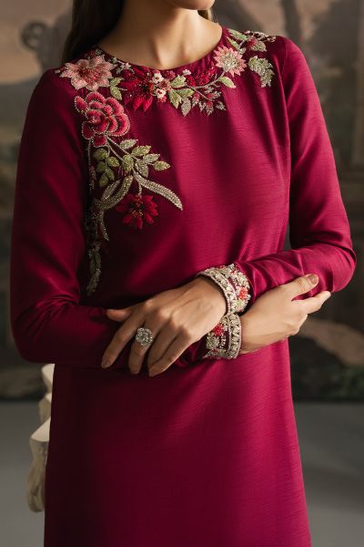 Syrah In a striking deep pink, Syrah a long, sleek straight shirt with refined detailing on the neckline, sleeves, and side slits, paired with cigarette pants for a clean, modern silhouette. The look is completed with a graceful organza dupatta, delicately worked on its short pallus, bringing together elegance and sophistication with effortless charm.