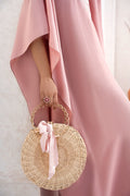 Pink raw silk kaftan with a clean, relaxed silhouette, designed with white resham embroidery along the neckline and edges. The garment is further embellished with milky white handwork and subtle crystal accents scattered across the fabric for added detail. The overall look is simple yet elegant, with the focus on the soft, lustrous texture of the raw silk fabric.