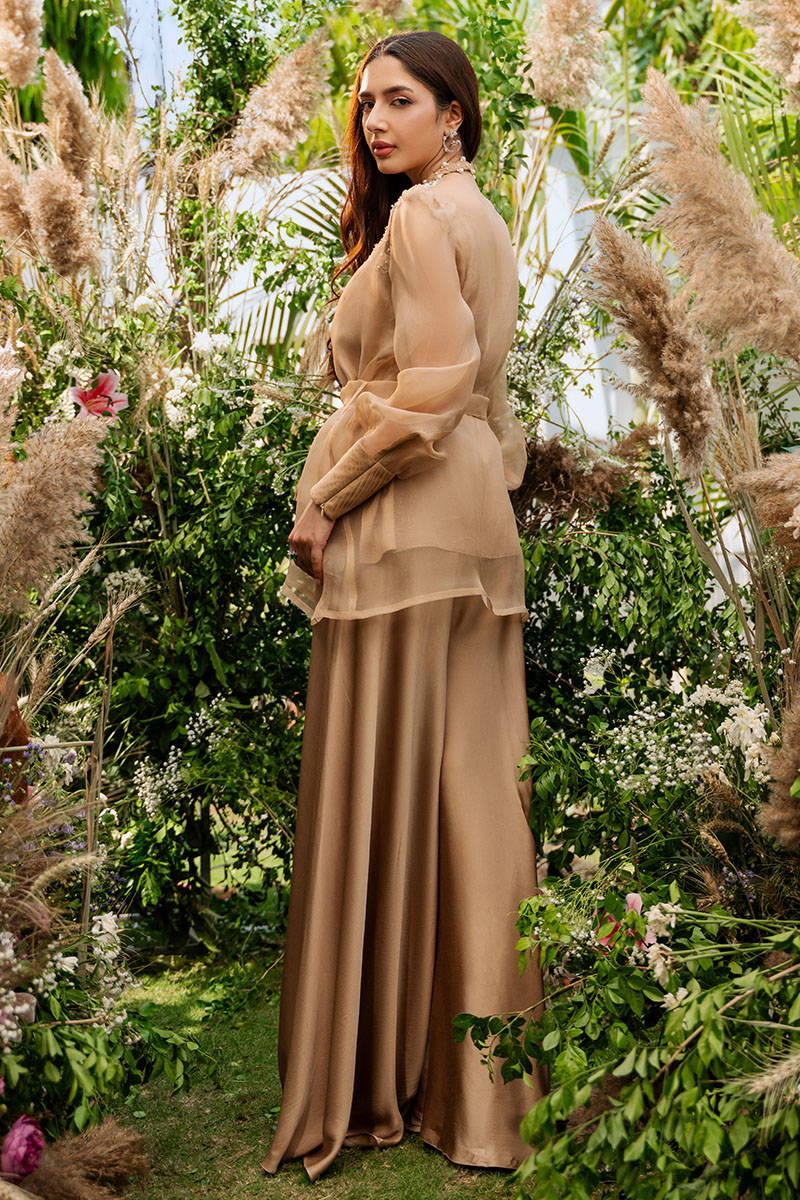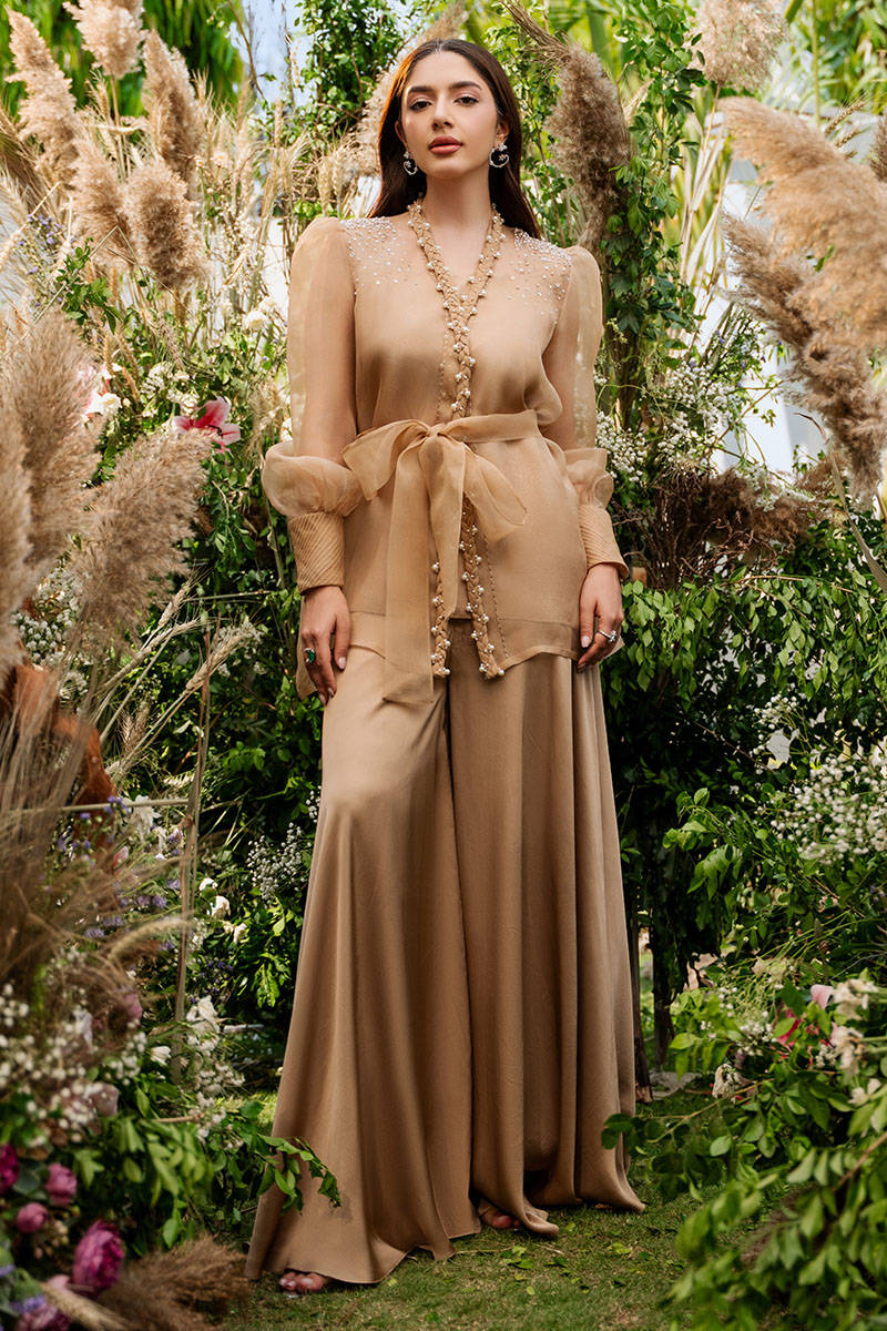 Terracotta is a pure organza wrap featuring a delicately embellished braid around the neckline, offering a look that's both sophisticated and effortlessly chic. The cuffed sleeves with pleated detailing add a modern edge, while a matching belt cinches the waist for a flattering silhouette. Paired with same-color silk slip and paired with flowy silk pants, this ensemble is the perfect blend of grace and contemporary style.