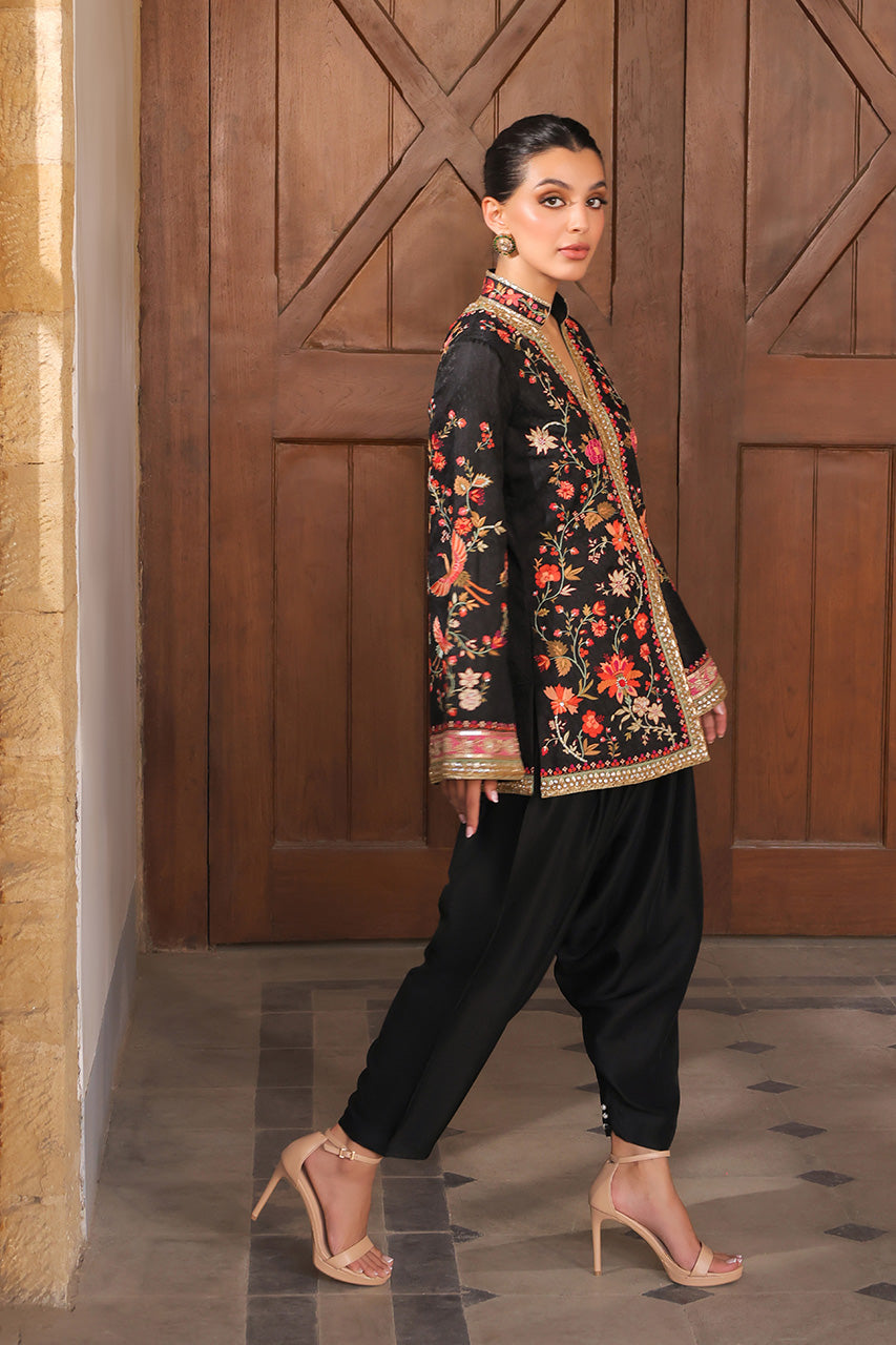 Merging elegance with artisanal craft, the ebony self jamawar jacket falls in a sleek, straight jacket silhouette. Aari embroidered florals in deep rose, marigold, rouge, and burnished gold flow across the surface like a nocturnal garden. Applique borders on the neckline and cuffs are enriched with resham, gota, antique dabka, and sequins that glimmer with each movement. Paired with a voluminous pure rawsilk shalwar in matching ebony, the ensemble captures the essence of confident minimalism.