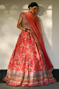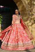 This vibrant lehenga features a striking watermelon print, crafted on flowy fabric that adds movement and flair to the silhouette. It is paired with a structured raw silk choli in a matching watermelon tone, designed with elegant cap sleeves for a modern yet traditional feel. The ensemble is elevated with an ombré net dupatta that transitions beautifully in color and is adorned with intricate embellishments — including Swarovski stones, sequins, cutdana, and fine gota work — adding layers of texture and sparkle.
