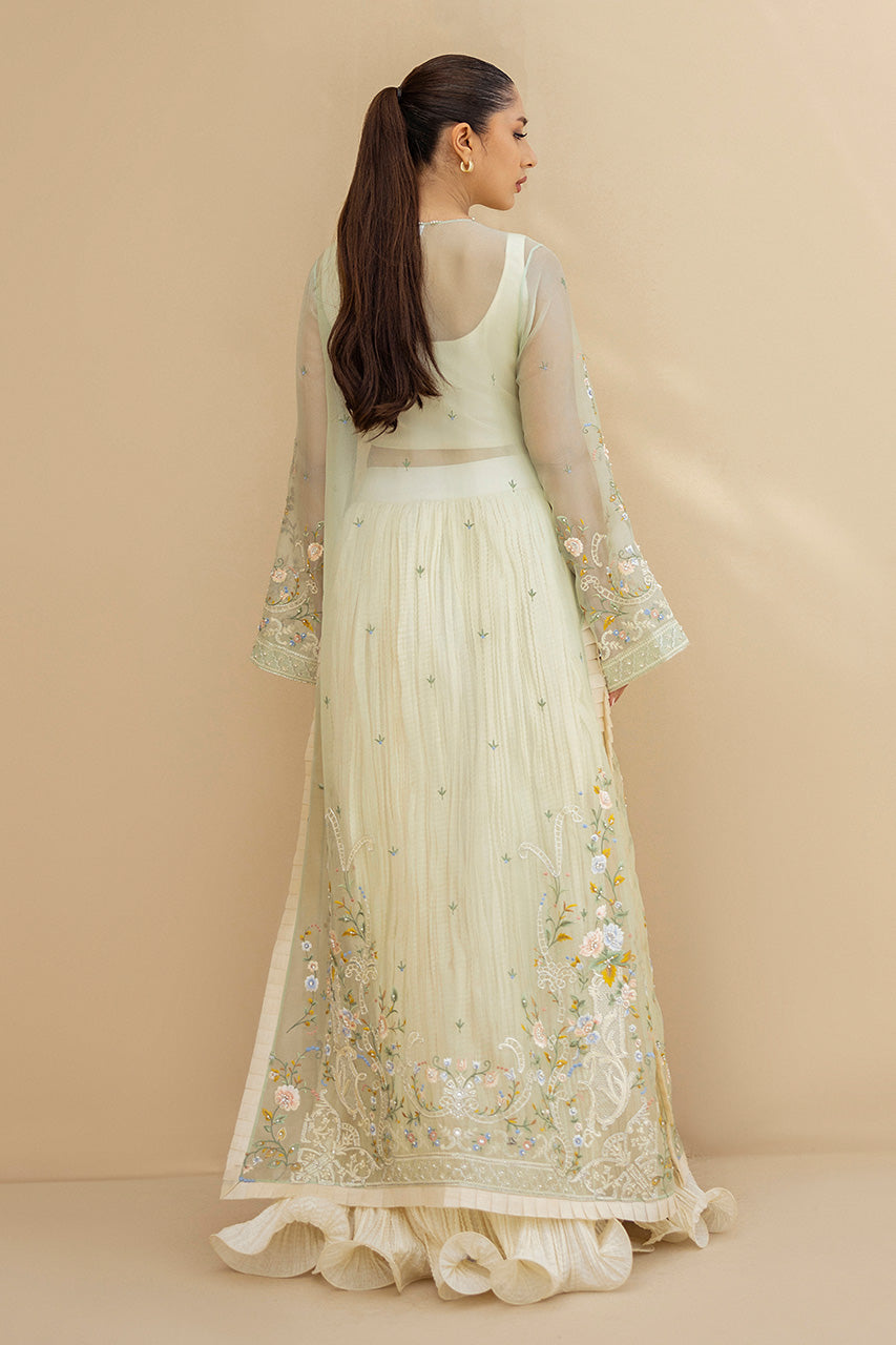 Awash in muted mint tones, a sheer front open shirt is detailed with floral threadwork, sequin accents, and handcrafted tassels that cascade down the front. Paired with a pleated crushed skirt that falls in graceful swirls, it becomes an ethereal statement.