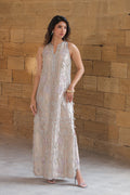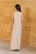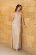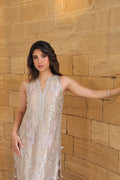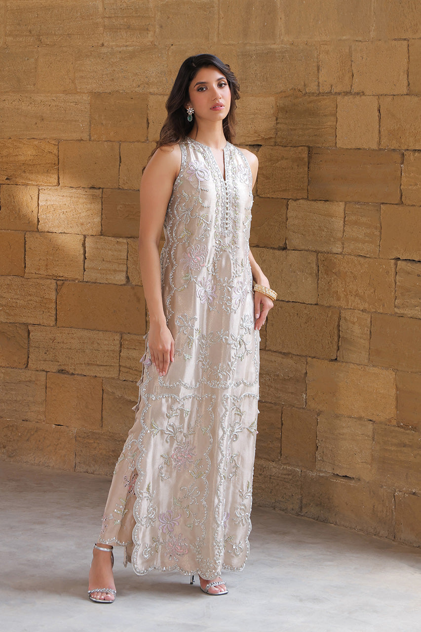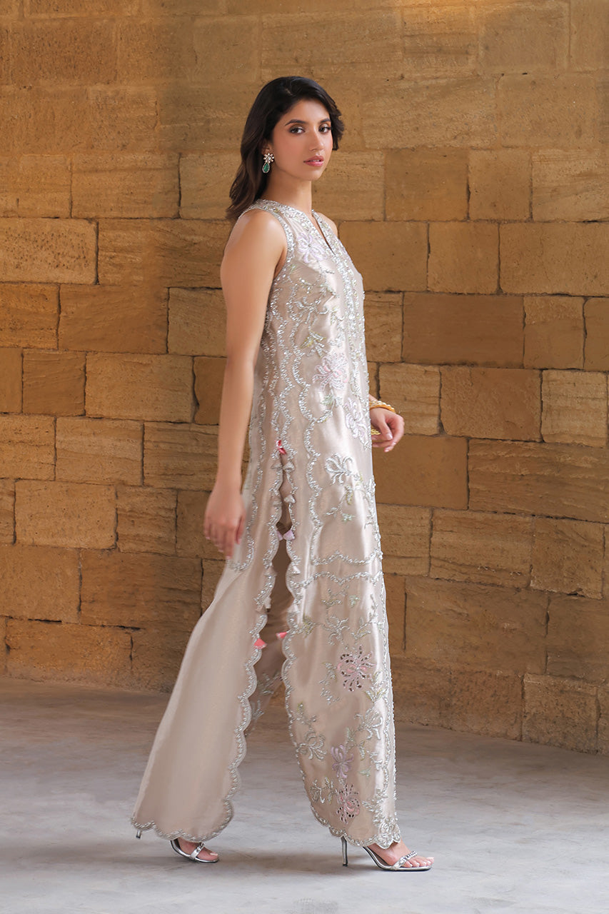 A sleeveless column shirt in metallic blush tissue shimmers with pastel resham florals, sequins, and pearls, arranged in soft scalloped bands that ripple with artisanal eyelet detail. The neckline glistens with fine zardoze accents, catching the light in quiet opulence. Paired with embellished pure rawsilk trousers, the sculptural silhouette channels the poise of couture evenings.