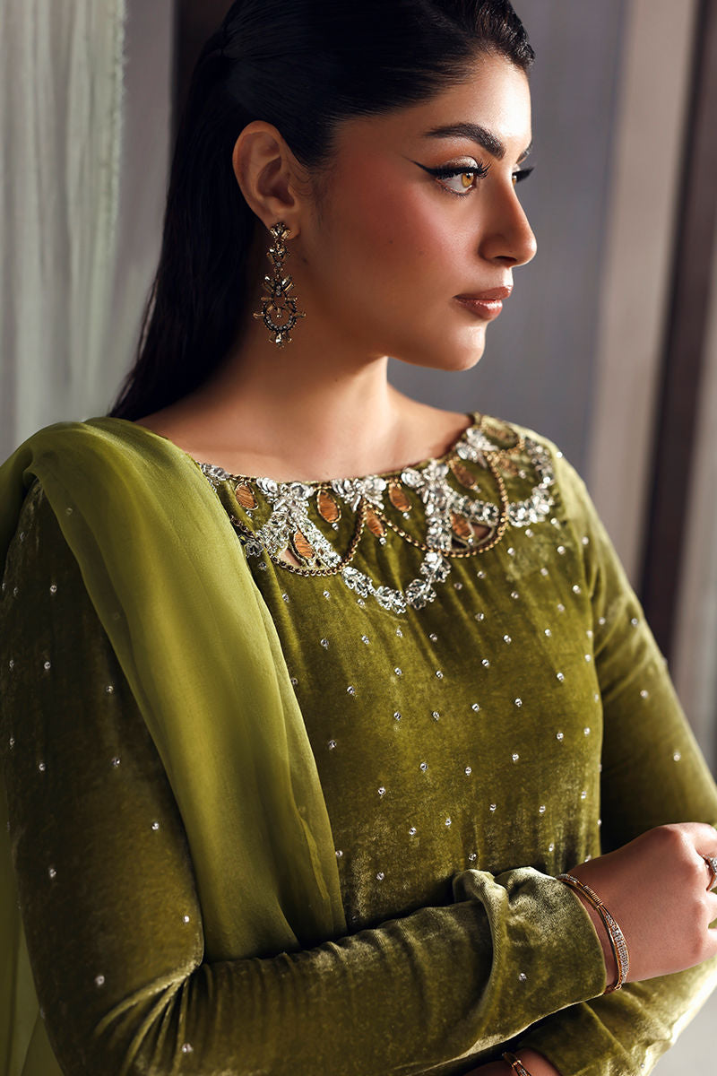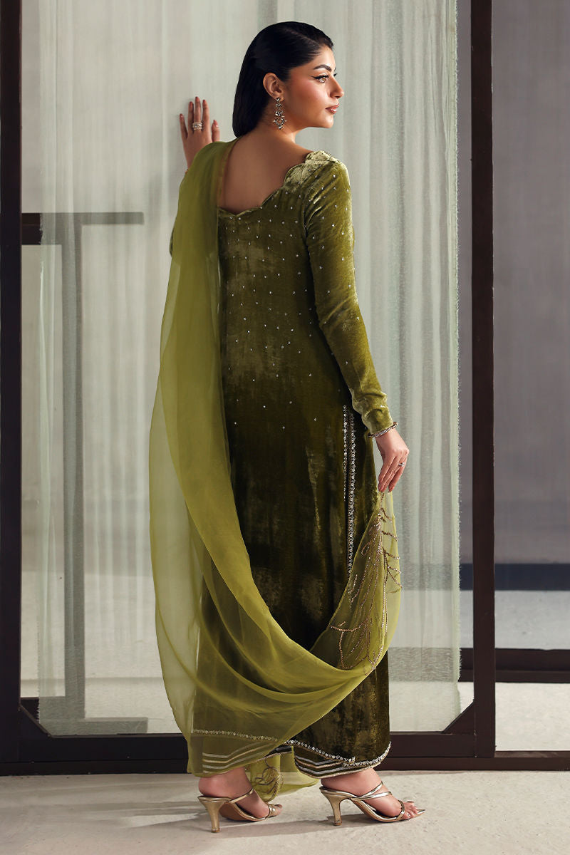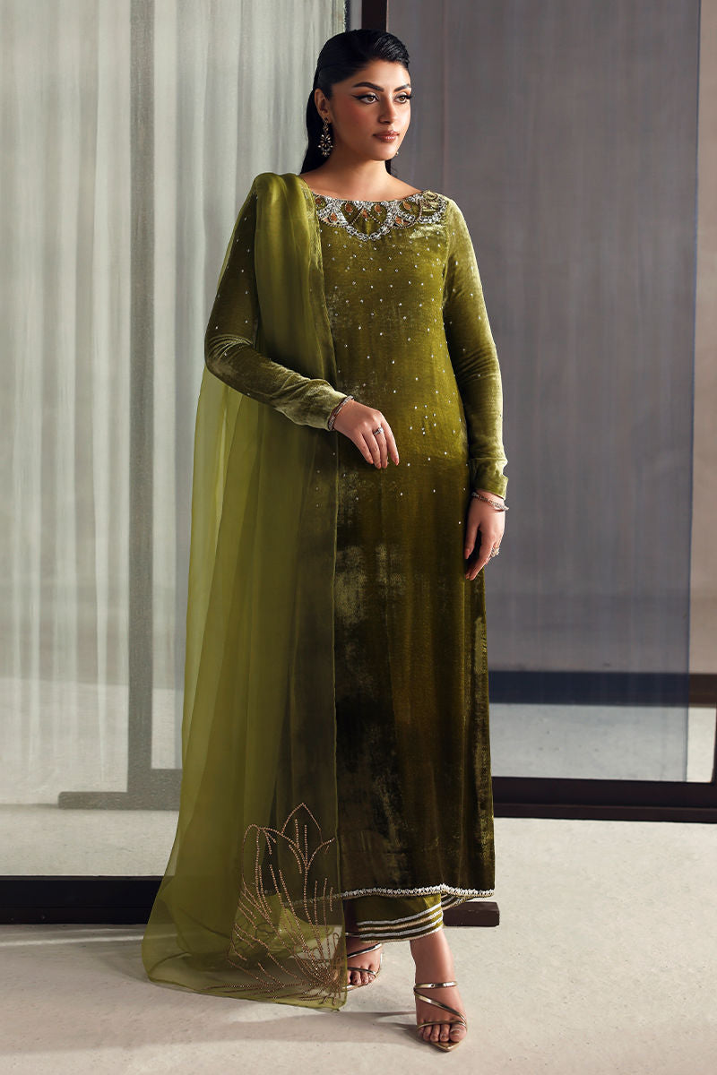 An elegant Leaf Green ensemble featuring a Pure Velvet shirt that exudes luxury and timeless charm. It is beautifully paired with Korean Raw Silk azar for a graceful fall and complemented with a Pure Organza dupatta, adding a touch of sophistication and delicacy to the overall look — perfect for festive and formal occasions.