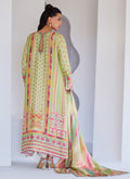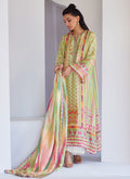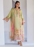 The gorgeous, digitally printed, pure medium silk dupatta in uplifting green, pink and coral tones completes your ensemble.