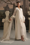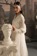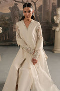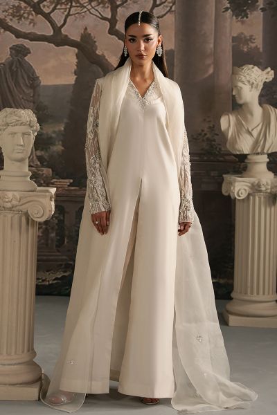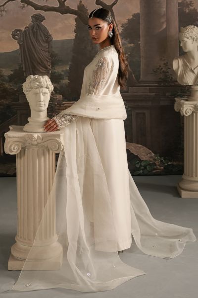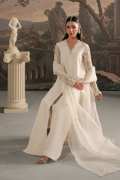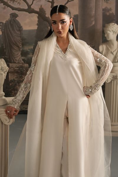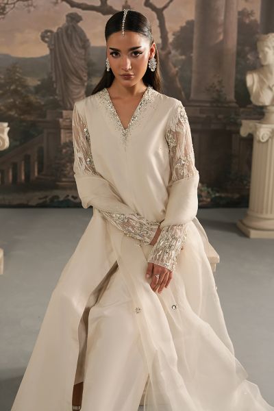 Vittoria is timeless sophistication with a three-paneled long shirt, refined with delicate detailing on the neckline and cuffs. Paired with sleek straight pants and an organza dupatta finished with intricate spray work, the silhouette embodies graceful elegance. Adorned with intricate hand embellishments of pearls, beads, cut dana, and silver chains, the ensemble strikes the perfect balance between refined artistry and luxurious allure.