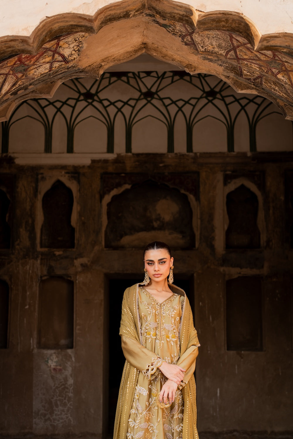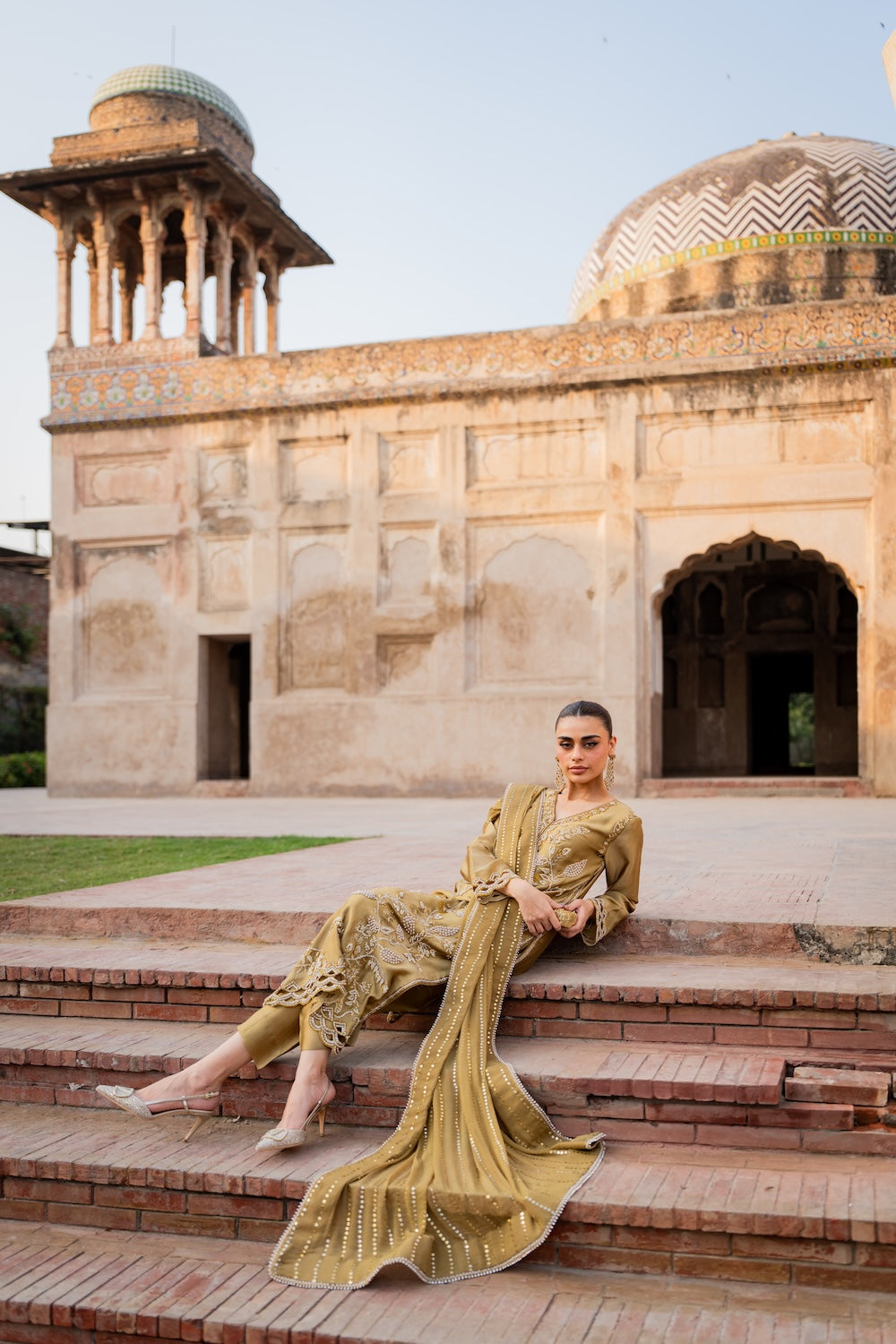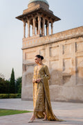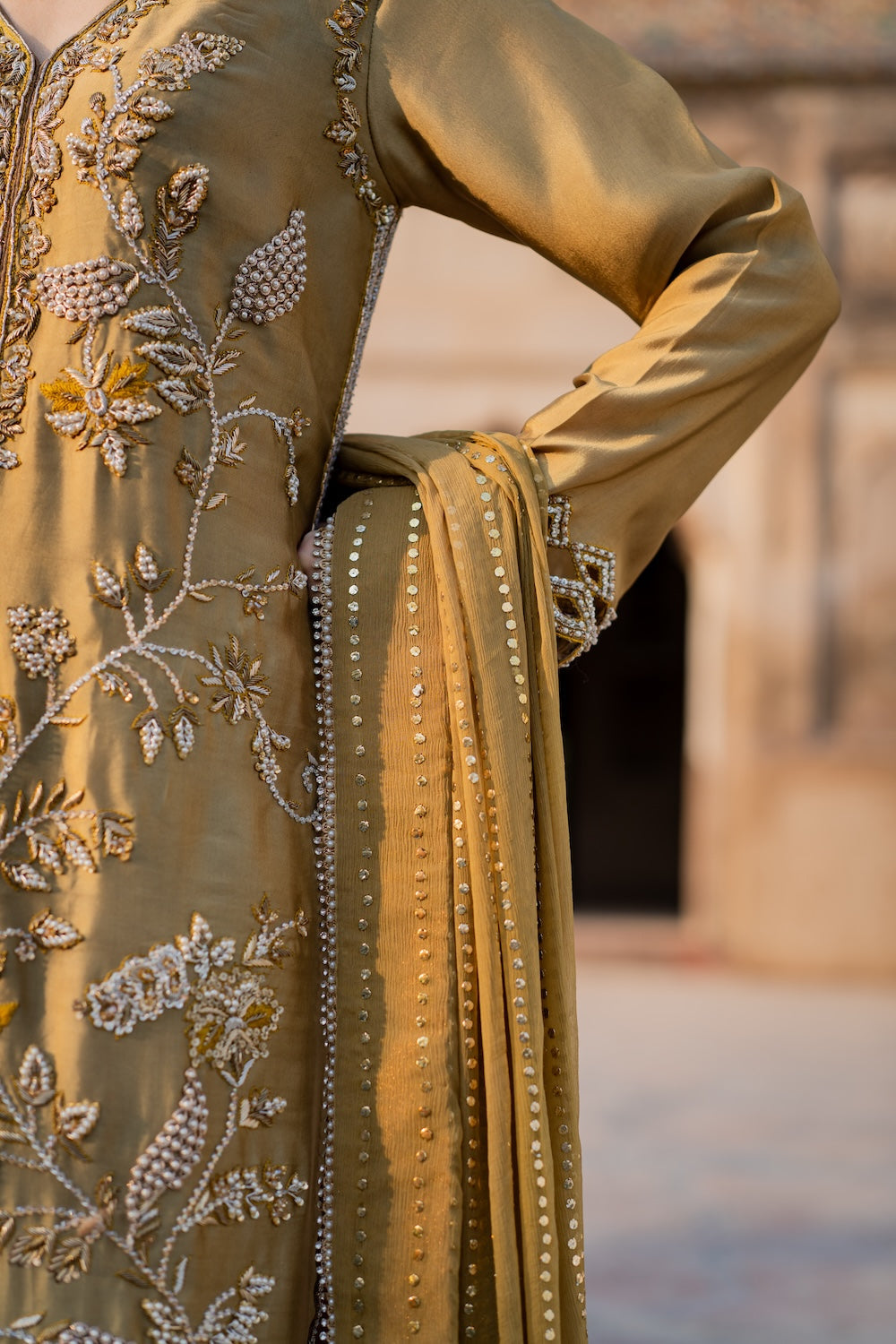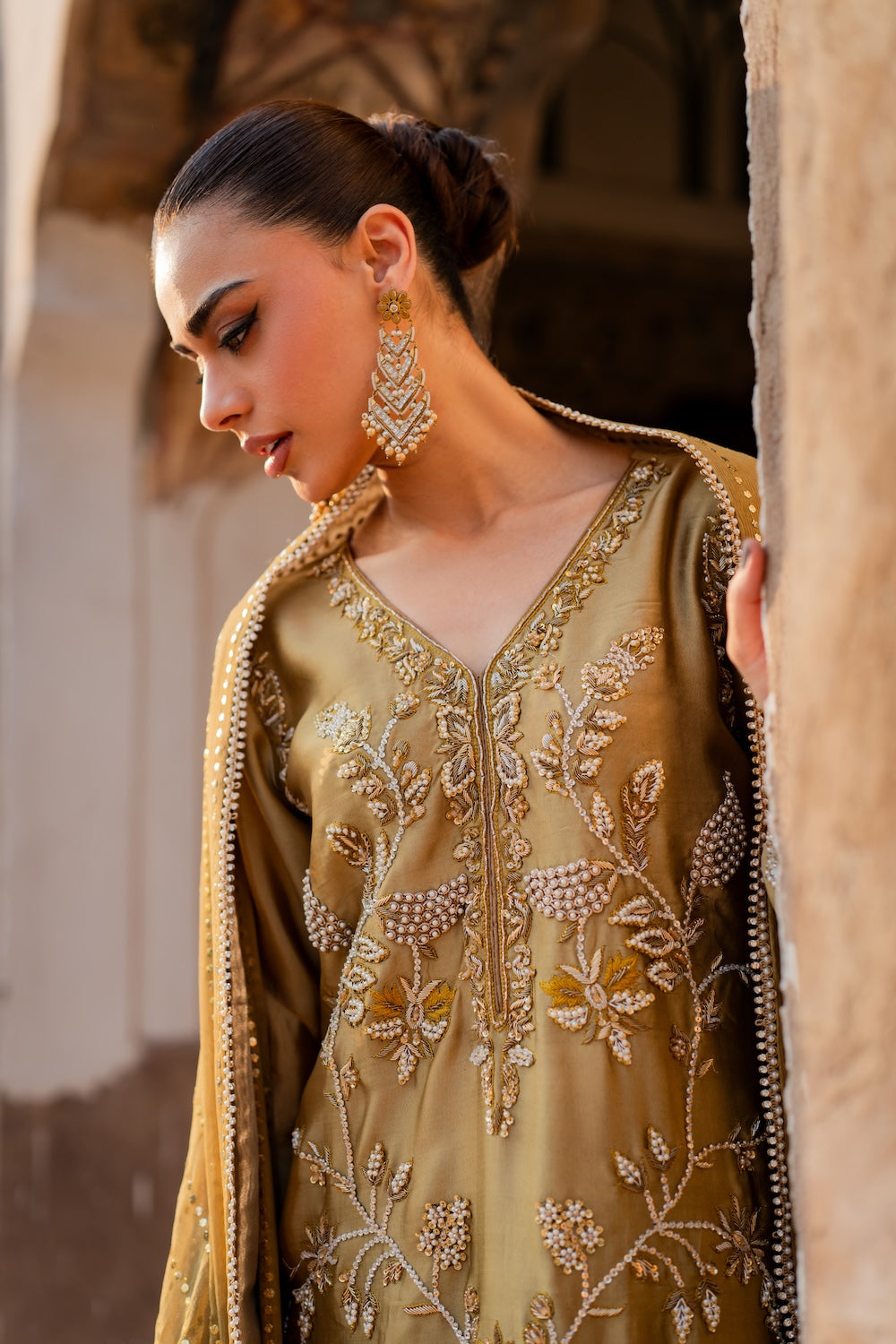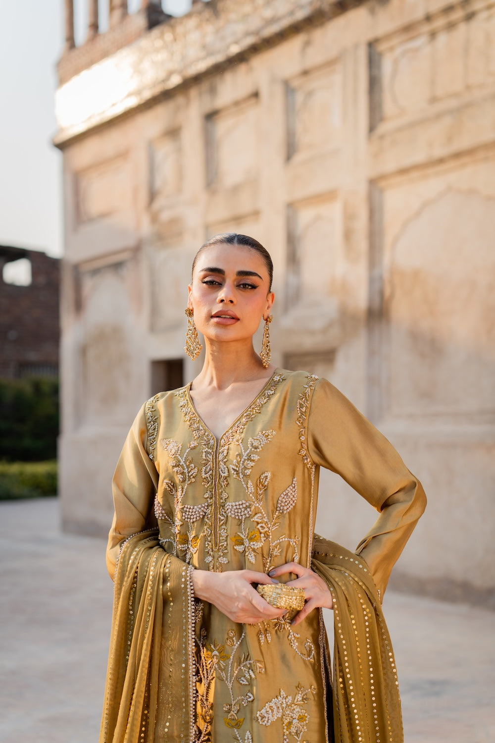 Wafaa is a stunning metallic gold ensemble, showcasing intricate silver embroidery with delicate pearls and subtle threadwork in matching accents. Paired with same‑colored pants and a luxurious dupatta, it exudes understated opulence