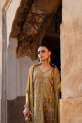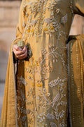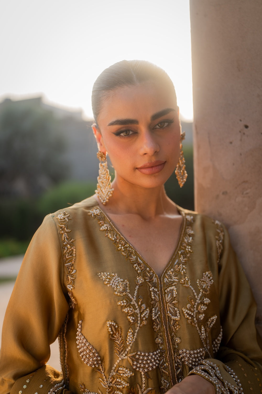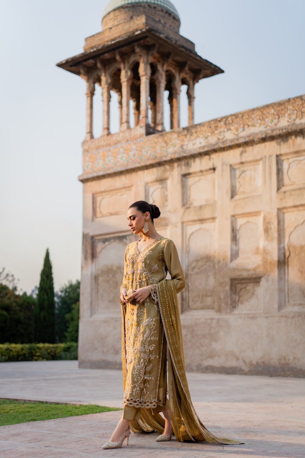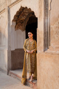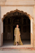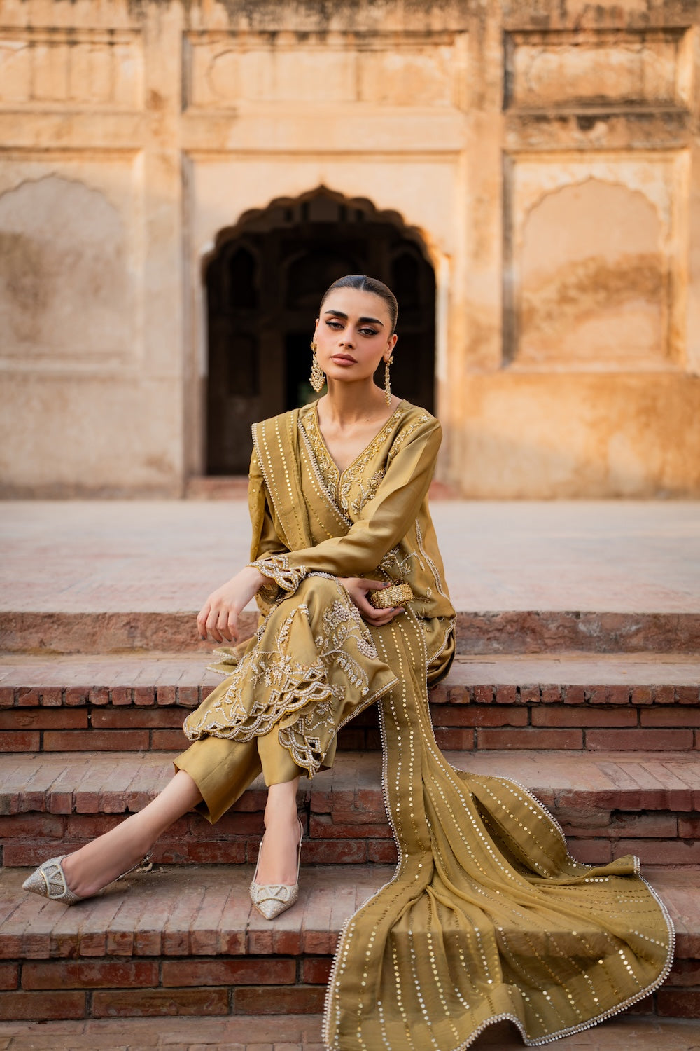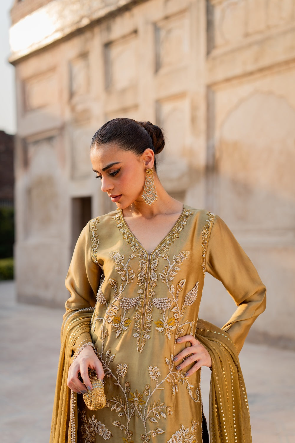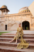 Wafaa is a stunning metallic gold ensemble, showcasing intricate silver embroidery with delicate pearls and subtle threadwork in matching accents. Paired with same‑colored pants and a luxurious dupatta, it exudes understated opulence
