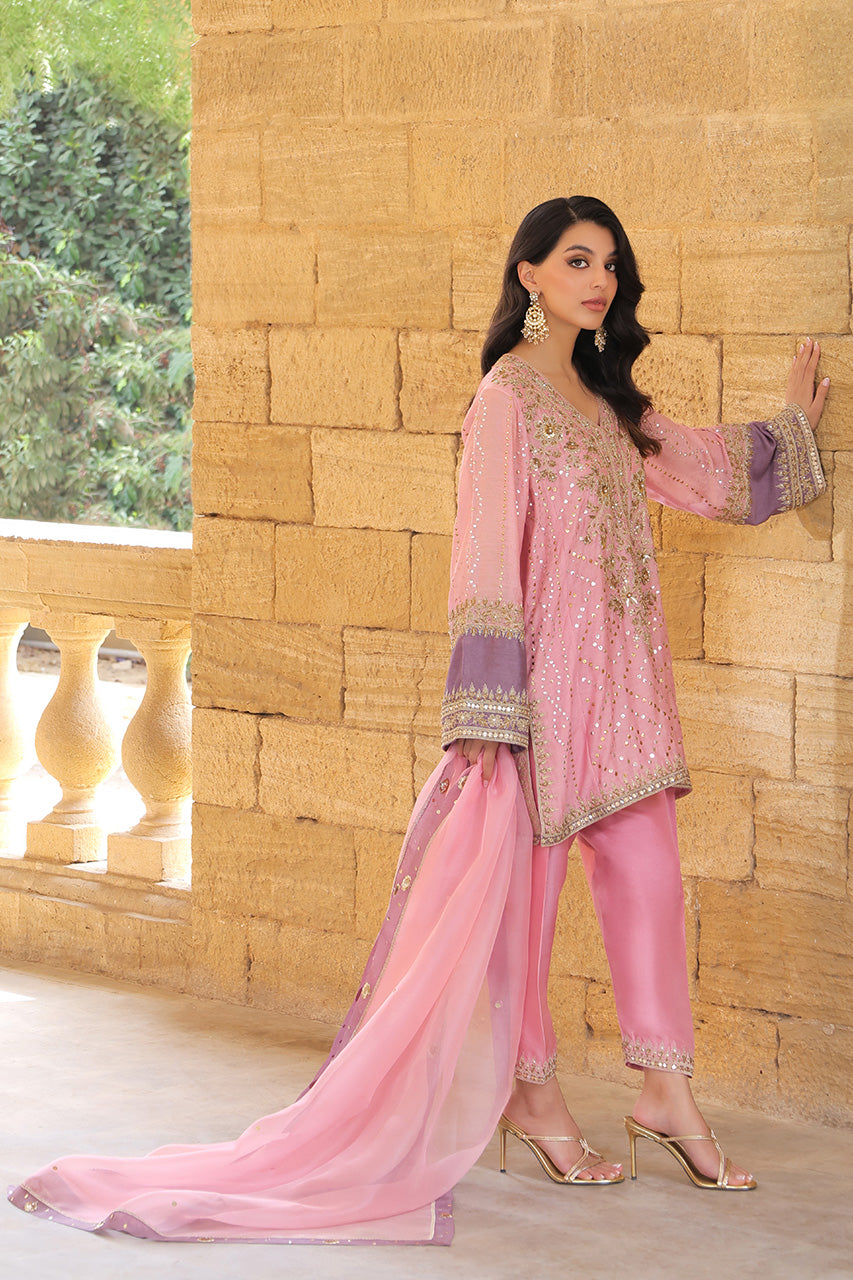 A relaxed cotton net kurta in flamingo pink is brought to life with delicate gota, zardoze, and resham florals, each stitch a nod to artisanal mastery. Statement lilac applique cuffs are framed with intricate tilla borders, lending a touch of contrast. Paired with a tailored pure rawsilk shalwar, its hem glinting with zardoze and sequins, the ensemble is anchored in quiet luxury. An ethereal organza dupatta, dusted with subtle shimmer and edged in lilac-hued embellishment, drapes the look in a whisper of vintage charm.