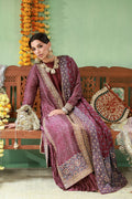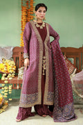Front-open raw silk jacket in deep purple with screen print detailing, adorned with gold kaam, sequins, gota, moti, and cut dana. Paired with crushed dhaka pants for added texture and volume.