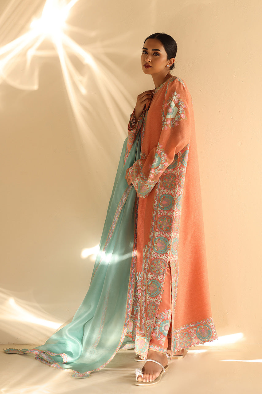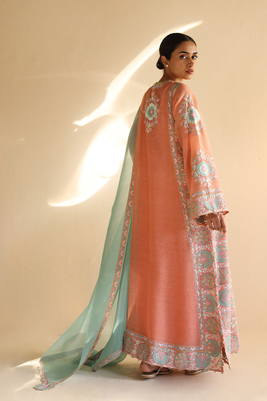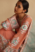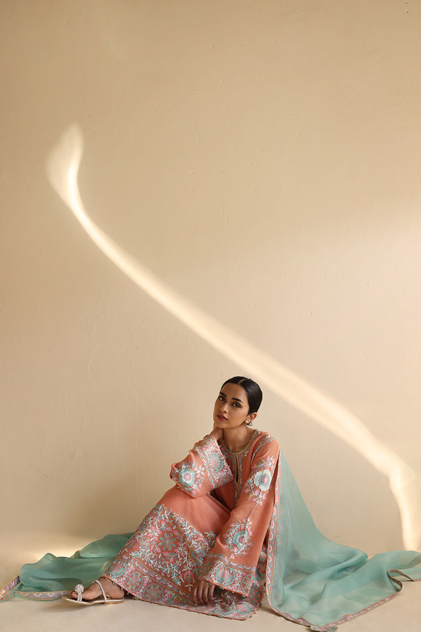 A serene coral hue forms a perfect canvas for an exquisite aari embroidered column shirt cut from khaddi silk and pure rawsilk culottes adorned with intricate aari work in pastel tones. Exuding timeless charm, a mint gossamer organza dupatta with a delicate hint of embroidery pairs with the ensemble gracefully.