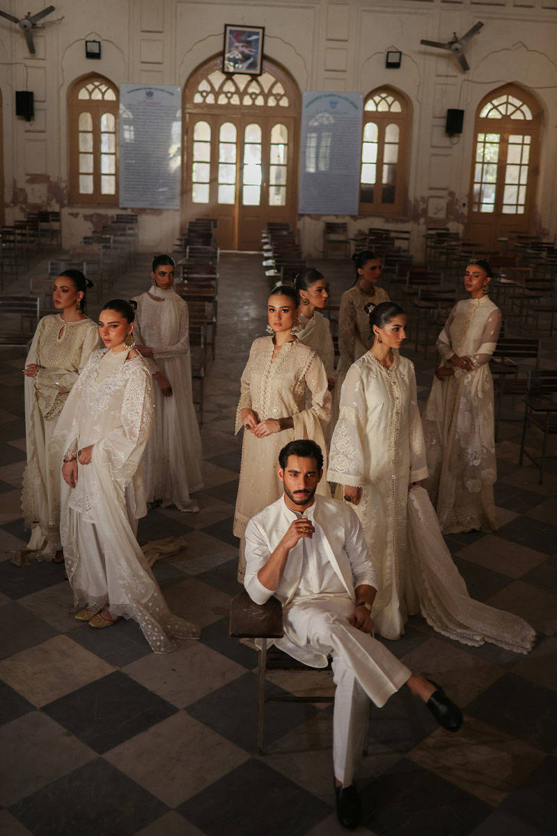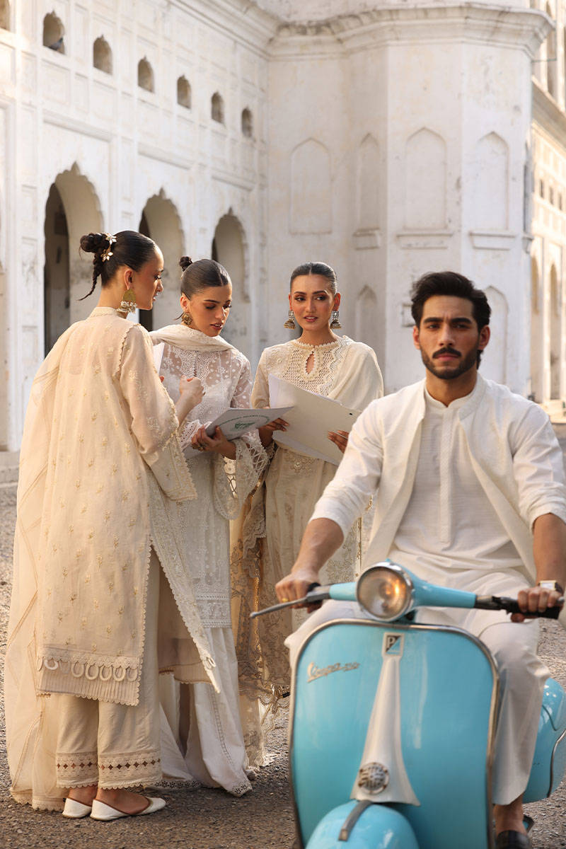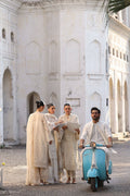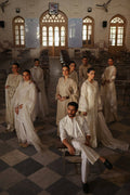 In matka silk, this kurta-and-trouser set is punctuated by a richly embroidered waistcoat, where swirling paisleys unfold in tonal thread. Anchor work and embroidery on the sleeves making the look polished, and worthy of any Eid gathering.