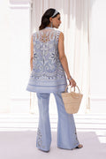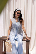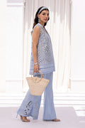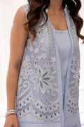 Sleeveless open-front jacket made in baby blue organza, layered over a plain crepe slip. The jacket features oversized khaddi silk appliqués in sage and purple, placed across the front and back. Cutwork detailing is incorporated throughout the appliqué, adding dimension without extra surface embellishment. The pants are bootcut, tailored with matching cutwork at the hem and a clean side slit on each leg for ease of movement.