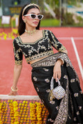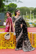 Draped in elegance, this black saree is crafted from soft medium silk and adorned with timeless block print detailing. It is paired with a raw silk blouse, hand-embellished to perfection and cut in a flattering sweetheart neckline with short sleeves. The luxurious textures and refined craftsmanship make this ensemble a statement of modern sophistication rooted in tradition.