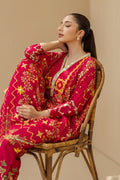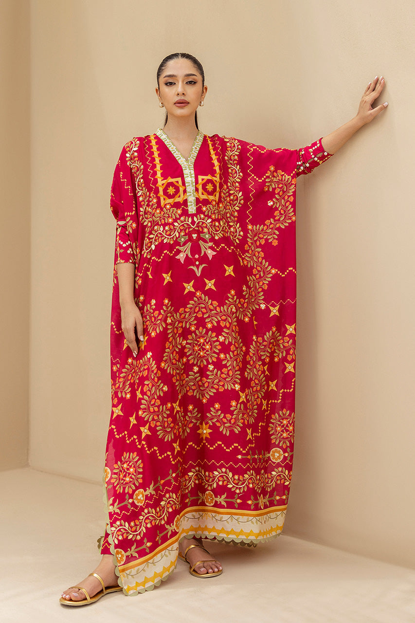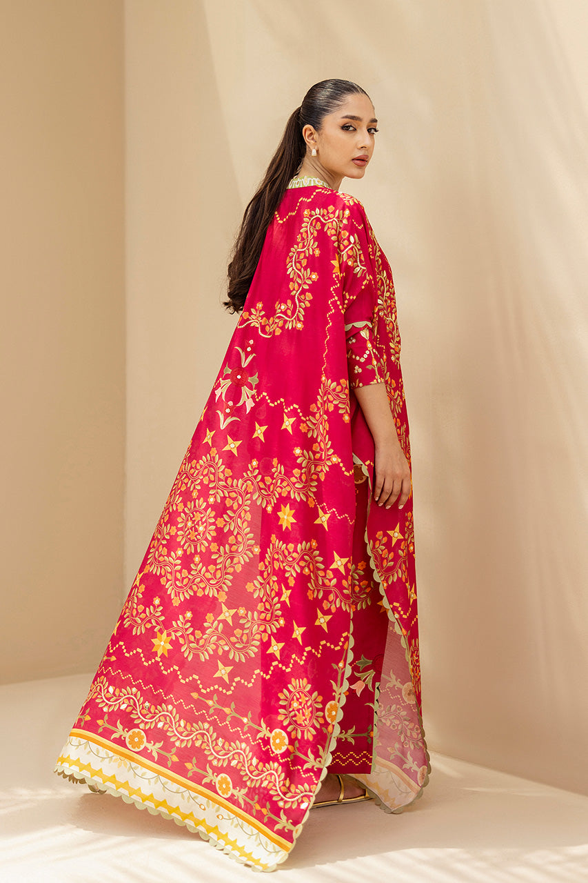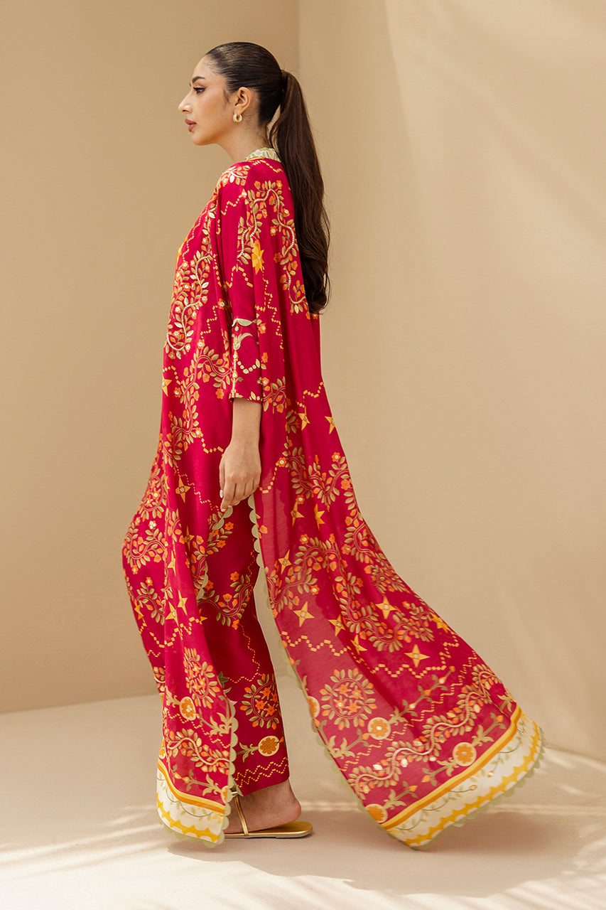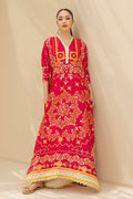 Crafted from khaddi silk, this ruby red kaftan is intricately adorned with gota accents, elevating the filigree floral print in muted tangerine and sage hue. The flowing silhouette features sage scallops on the hemlines and sides, while the V-shaped contrasting neckline is embellished with sequin and gota embroidery. Complete the look with matching pure rawsilk trousers, striking a harmonious blend of whimsy and understated elegance.