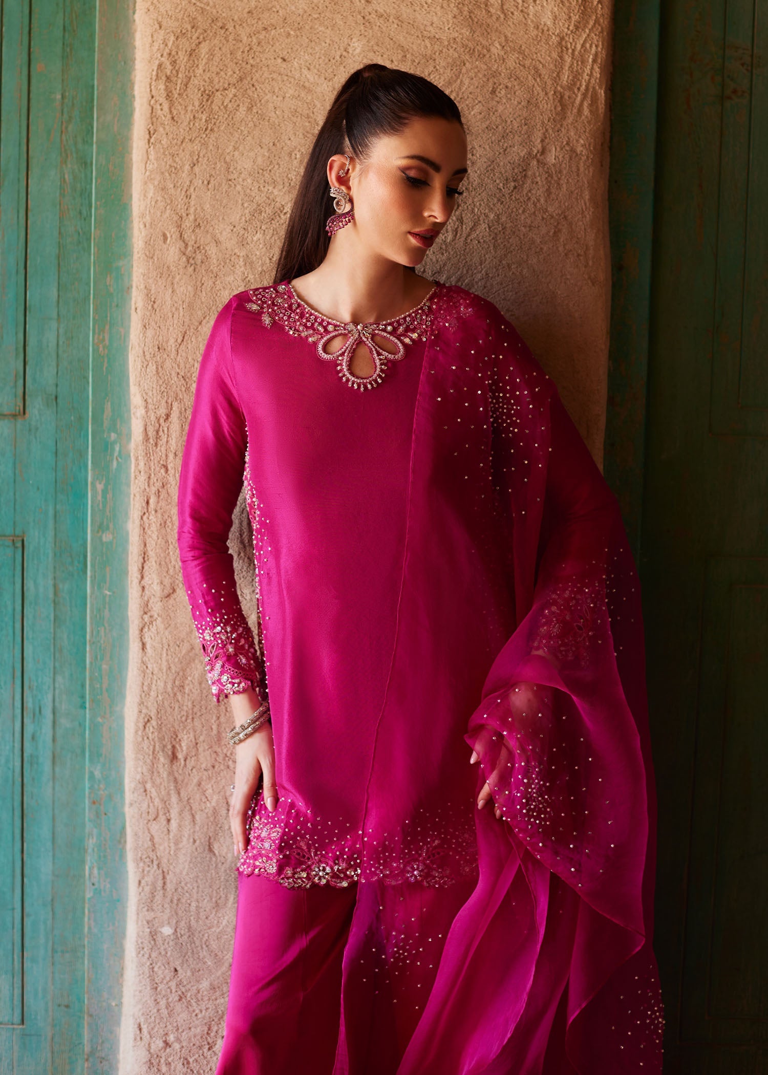 A striking shocking pink ensemble crafted from pure raw silk, adorned with intricate Ada handwork and precise machine embroidery along the sleeves, hemline (daaman), and neckline. The outfit is paired with Indian charmeuse fused flared sharara pants, adding movement and elegance, and is completed with a flowy medium organza dupatta featuring an all-over Ada spray embellishment, creating a vibrant and meticulously detailed look perfect for formal occasions.