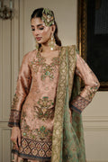 This outfit is a stunning traditional bridal or formal ensemble with rich embellishments and regal tones. Classic short shirt paired with a heavily embellished dacca pants and a coordinating dupatta. Luxurious raw silk for the shirt and dacca pants, with a sheer dupatta featuring embroidered borders. The outfit is of soft peachy pink with deep navy blue borders, rich green motifs, and gold zari detailing. It has intricate embroidery on the neckline, sleeves, and hem with shimmering sequins, zardozi work, and colored threadwork. It is paired with flared dacca pants style with ornate patterns in green and gold, highlighted with sequins, beads, and thread embroidery. Wide contrasting hem border with elaborate motifs and jewel-toned detailing. Dupatta is light green with a golden embroidered border and delicate motifs scattered throughout. A regal, traditional outfit with Mughal-inspired patterns and a rich color combination, ideal for weddings or high-end festive events. Potli bag can be added seperately.